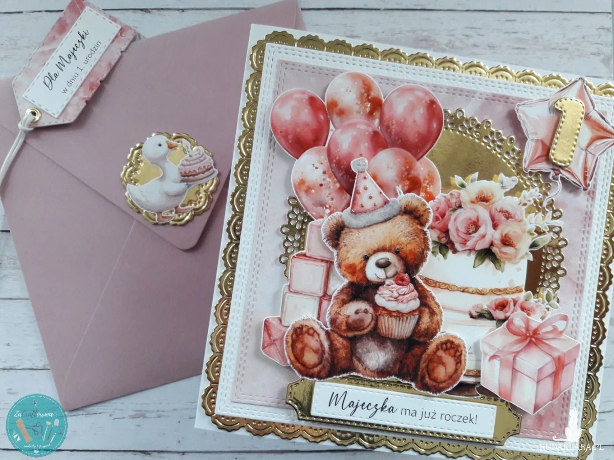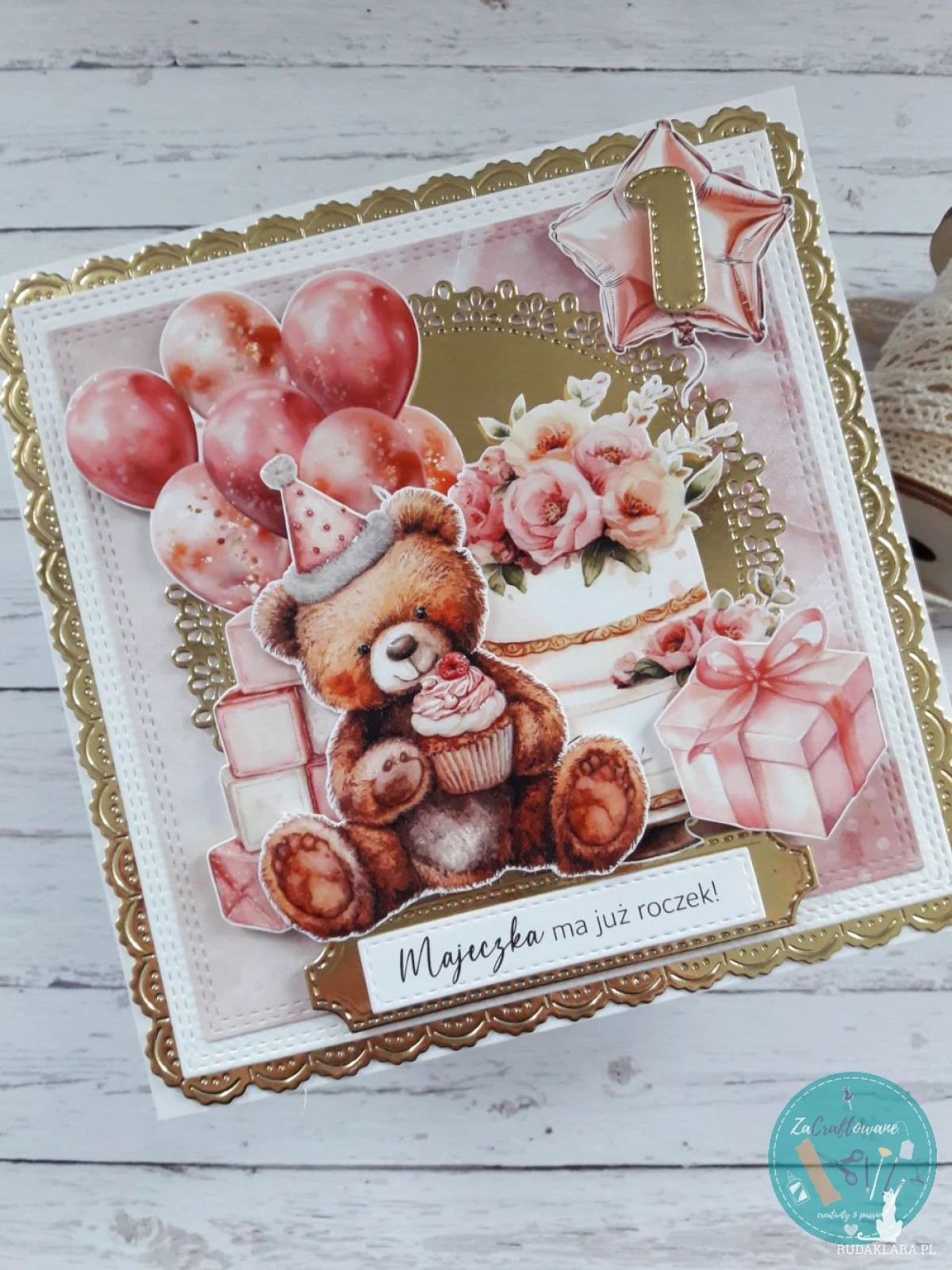 Motywem przewodnim kartki jest uroczy miś w otoczeniu balonów, klocków i tortu, który tylko czeka na świętowanie 1. urodzin razem z Małą Solenizantką. Kartka będzie idealnym dopełnieniem prezentu na roczek oraz piękną pamiątką tego wyjątkowego dnia.