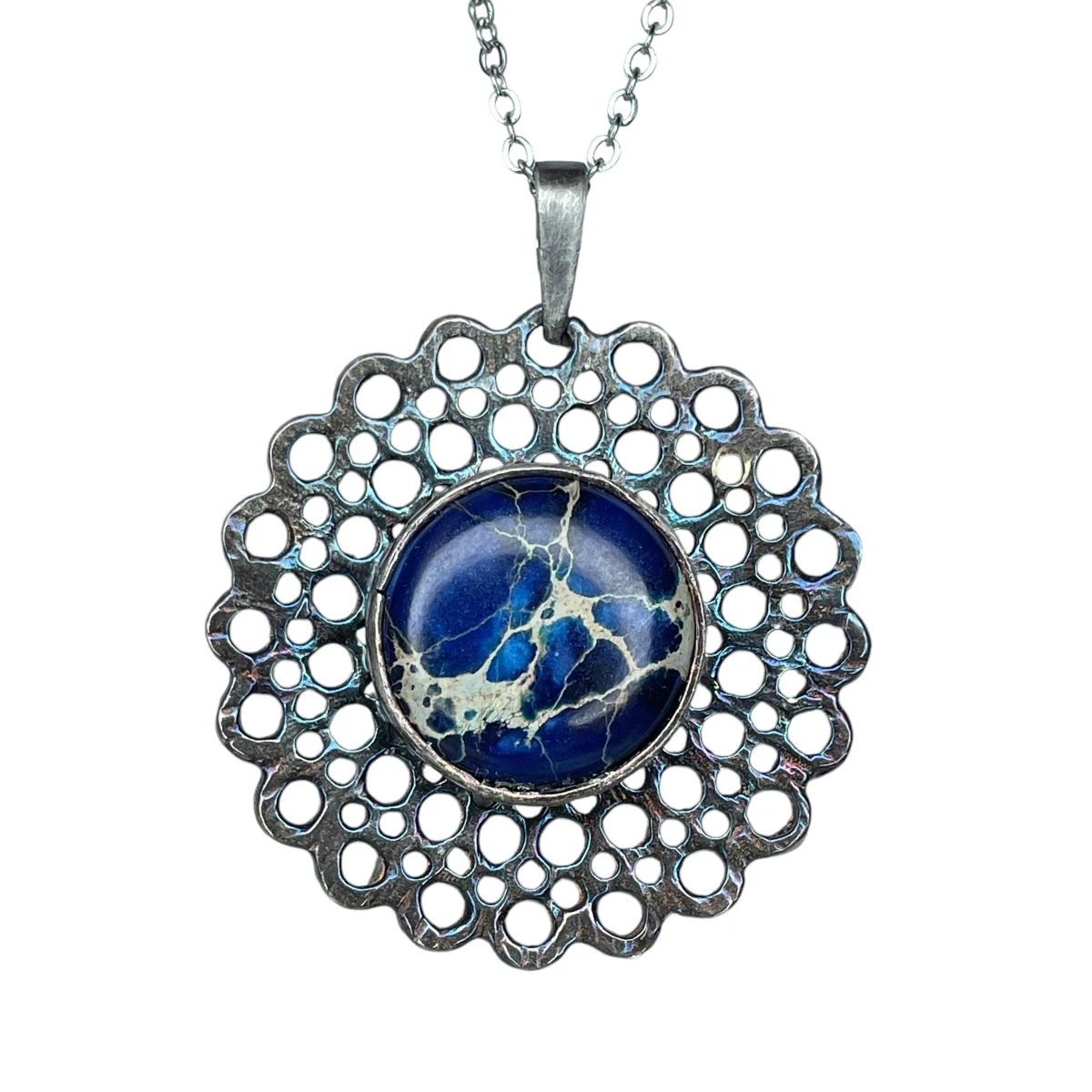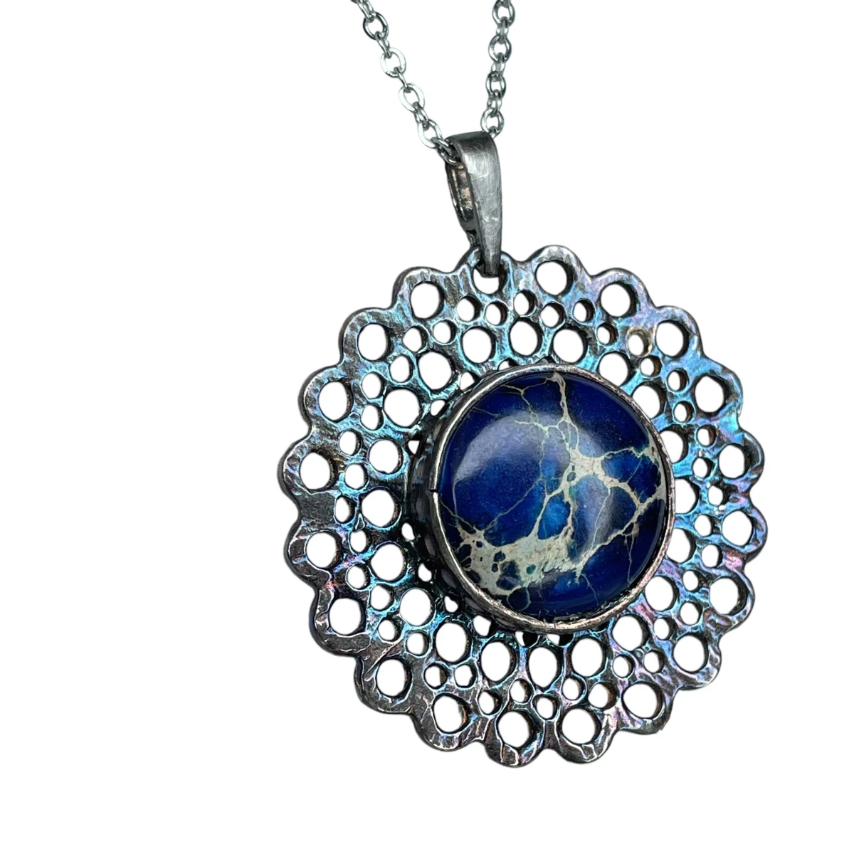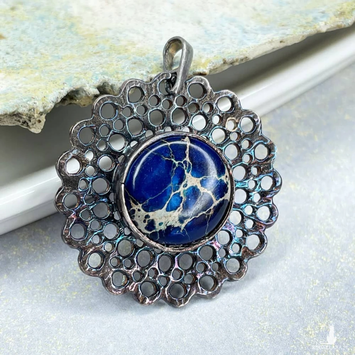 Ażurowy wisior ze srebra to wyjątkowy dodatek, który doda charakteru każdej stylizacji. Stworzony dla kobiet ceniących oryginalne wzory i elegancję. Centralnym elementem jest błękitny jaspis cesarski, który przyciąga spojrzenia. Dzięki oksydowanemu srebru próby 925 biżuteria zyskuje głębię, a delikatny wzór koronki zostaje podkreślony. Doskonały na prezent dla miłośniczek unikatowych dodatków.