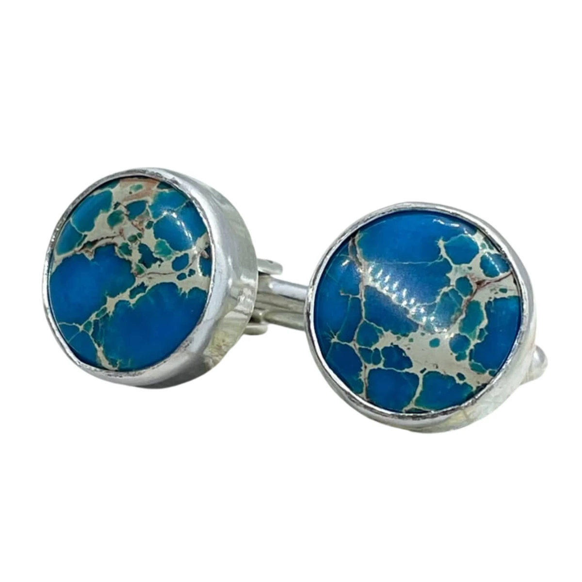 Okrągłe spinki do mankietów wykonane zostały ze srebra próby 925 i malowniczych jaspisów cesarskich. Oryginalne wybarwienie kamieni przywodzi na myśl wzburzoną morską toń. Srebro w procesie tworzenia było polerowane dla wydobycia z niego wyjątkowego blasku. Spinki będą stylowym uzupełnieniem męskiego stroju wieczorowego lub trafionym prezentem dla przyszłego pana młodego.