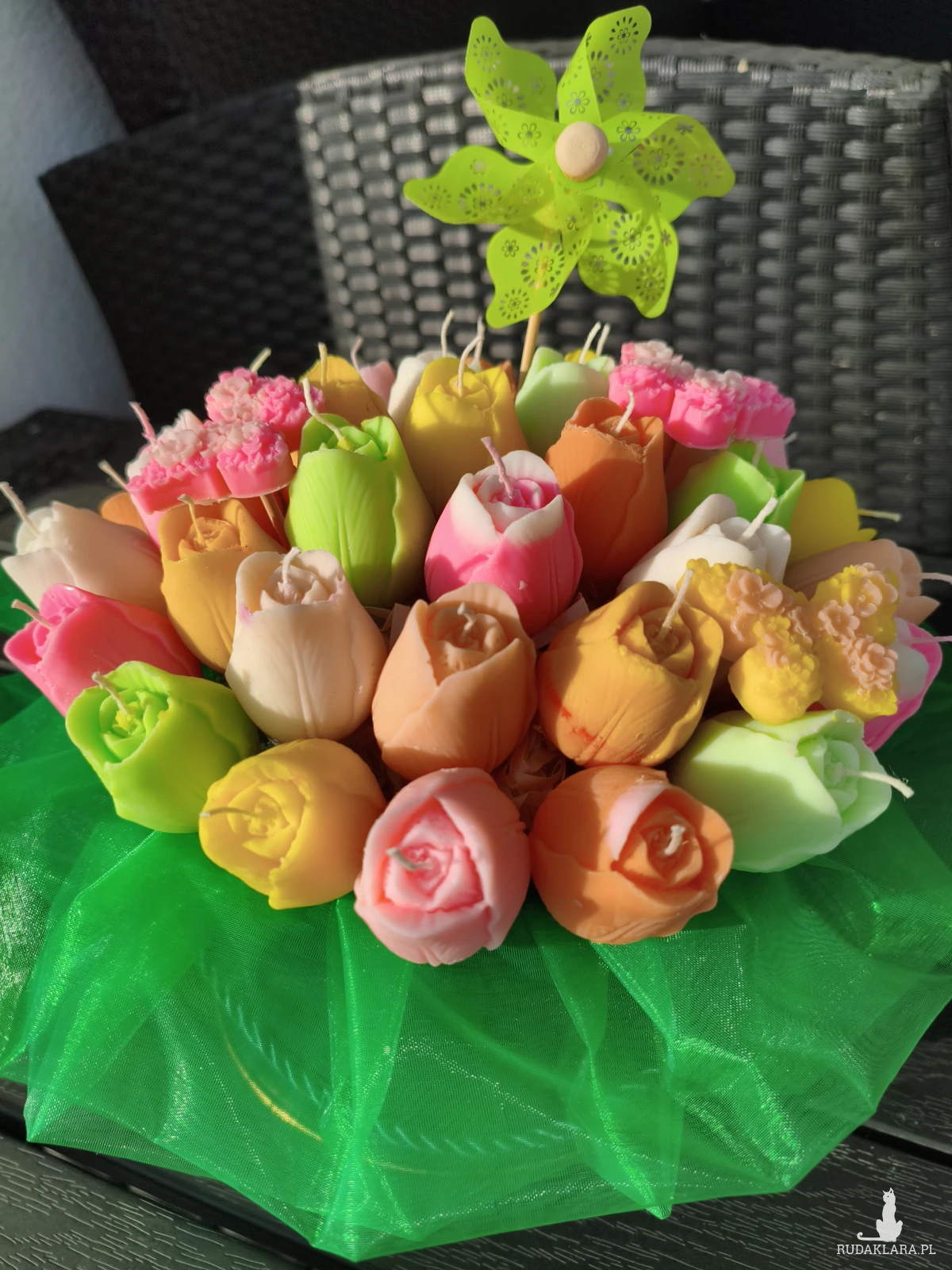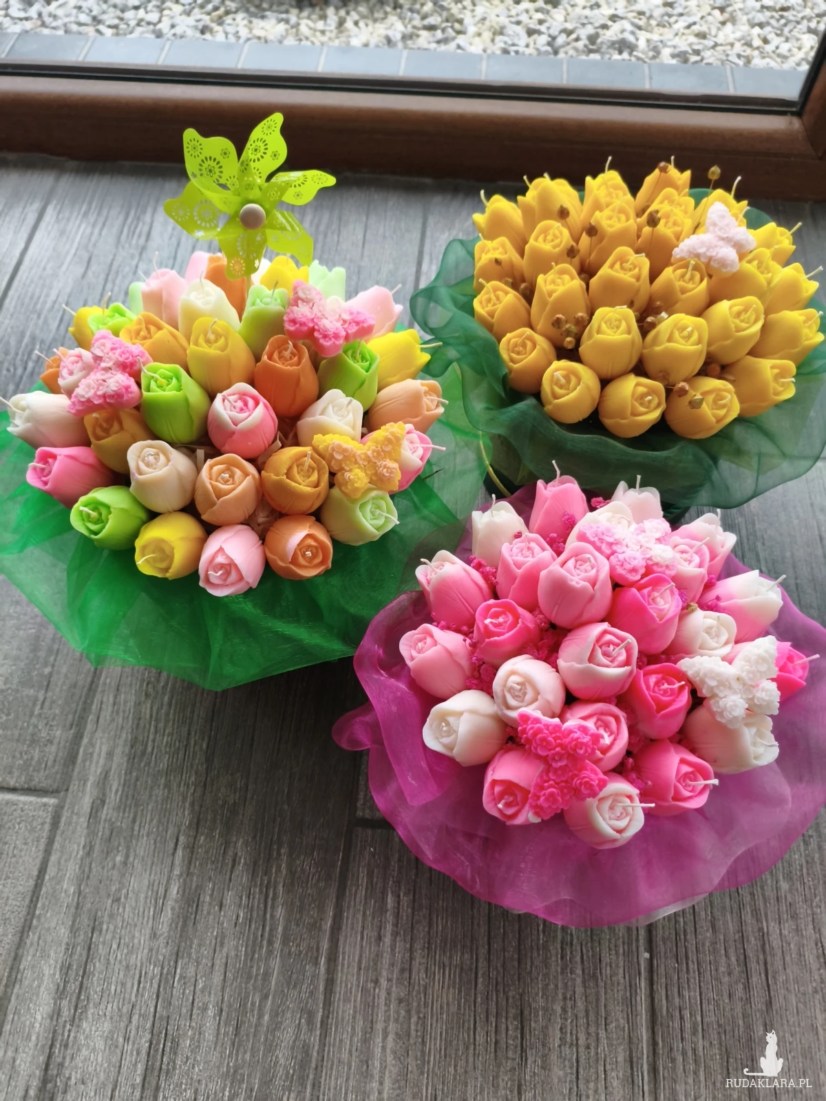 Flower box zawiera główki kwiatów które po wyciągnięciu z bukietu można zapalić. Flower box wysyłam zapakowany w celofan, wstążkę i bukiecik ze suszu oraz instrukcją palenia świec - gotowy do wręczenia jako prezent.