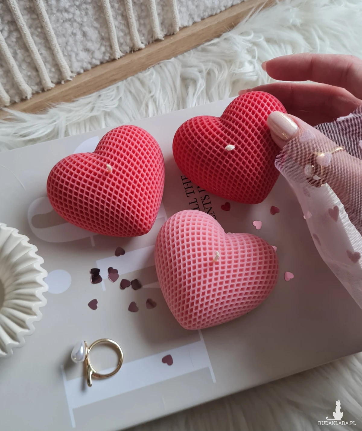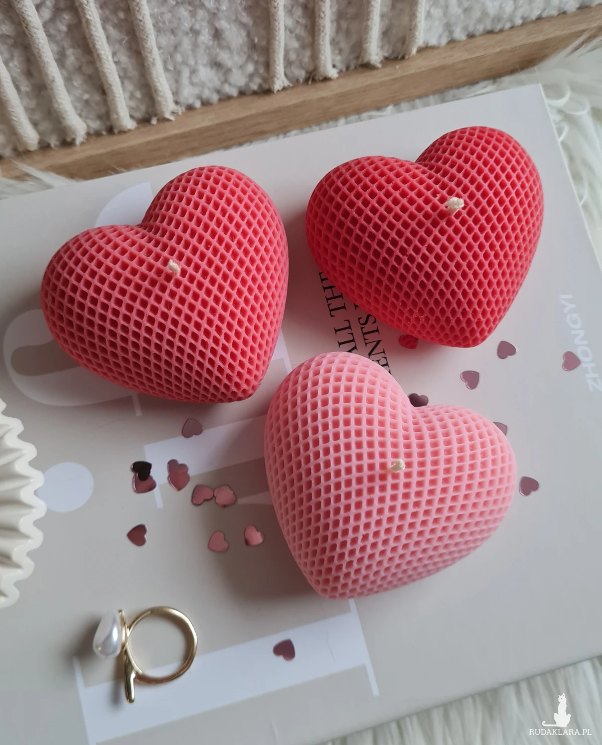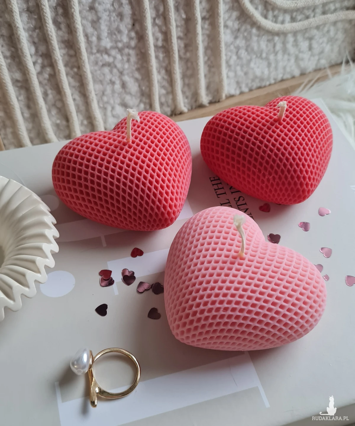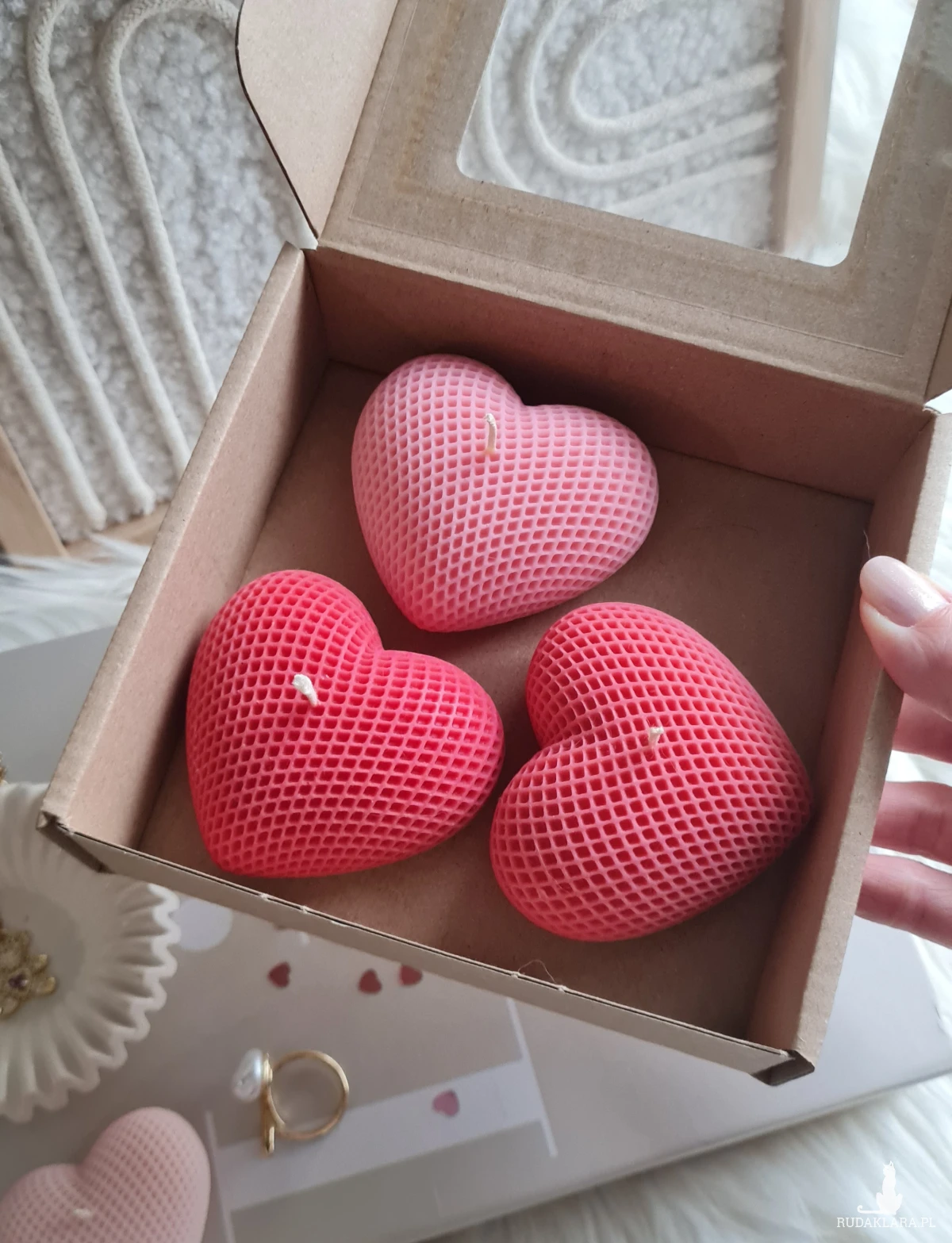 Zestwa świec sojowych 100 % handmade w kształcie serduszek w kolorze czerwonym i różowym. Tworzy przytulną atmosferę i stanowi świetny pomysł na oryginalny prezent na zbliżające się walentynki lub dzień kobiet.
