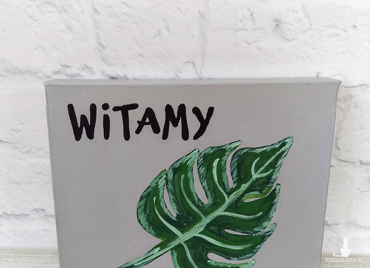 Liść monstery to piękny zielony akcent, który wzbogacony napisem mile powita gości.