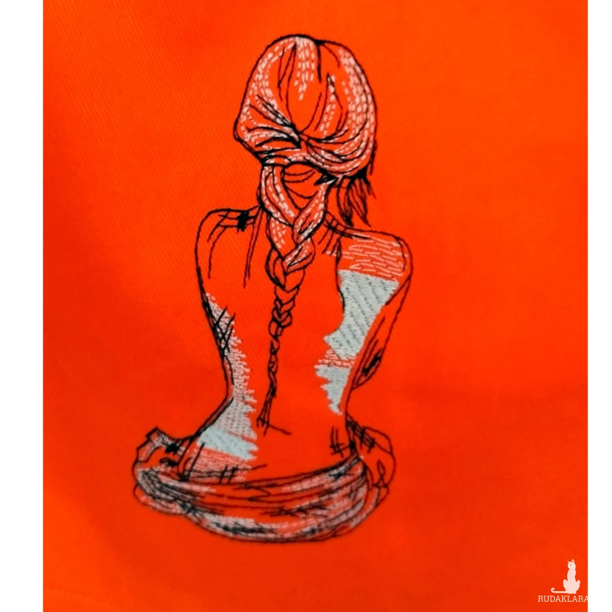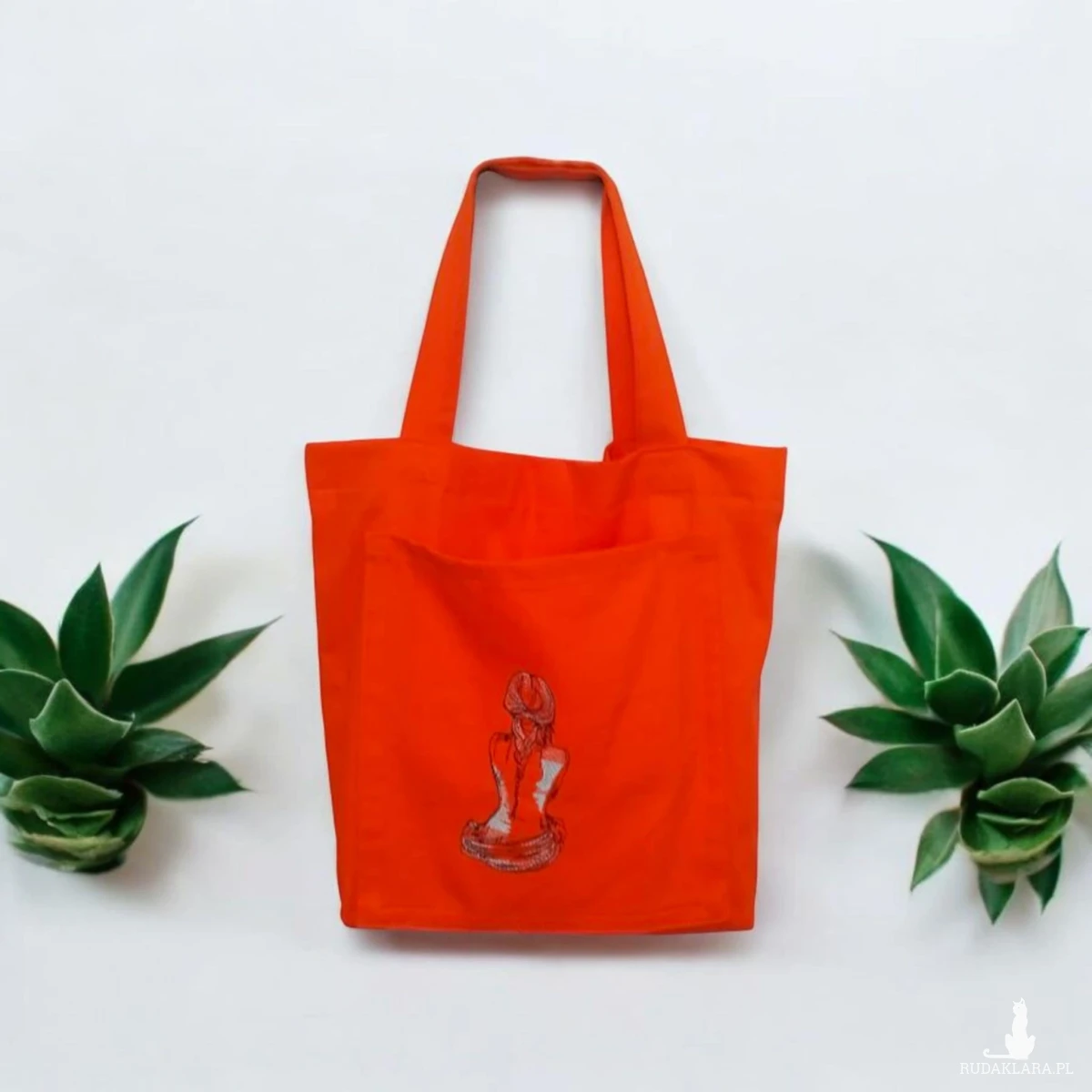 Przód torby z dużą kieszenią ozdobioną haftem.  Dno torby  poszerzone - tak aby mogła pomieścić wszystkie niezbędne drobiazgi i przydasie.