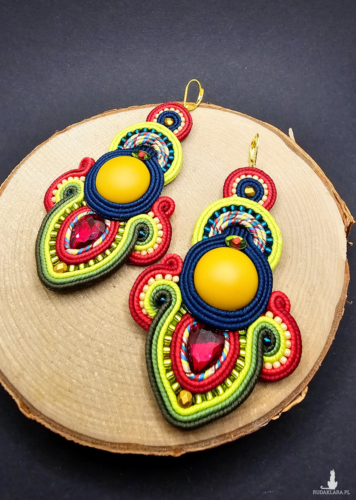 Matowe akrylowe kaboszony w kolorze miodowym otoczone polskimi sznurkami sutasz, szklanymi czeskimi i japońskimi koralikami o rożnych kształtach i wielkościach oraz niewielkimi fasetowanymi kryształkami. Kolory w kolczykach: miodowy, ciemny morski, czerwony, odcienie koloru zielonego, bordowy. Kolczyki zawieszone na biglach angielskich w kolorze złotym.