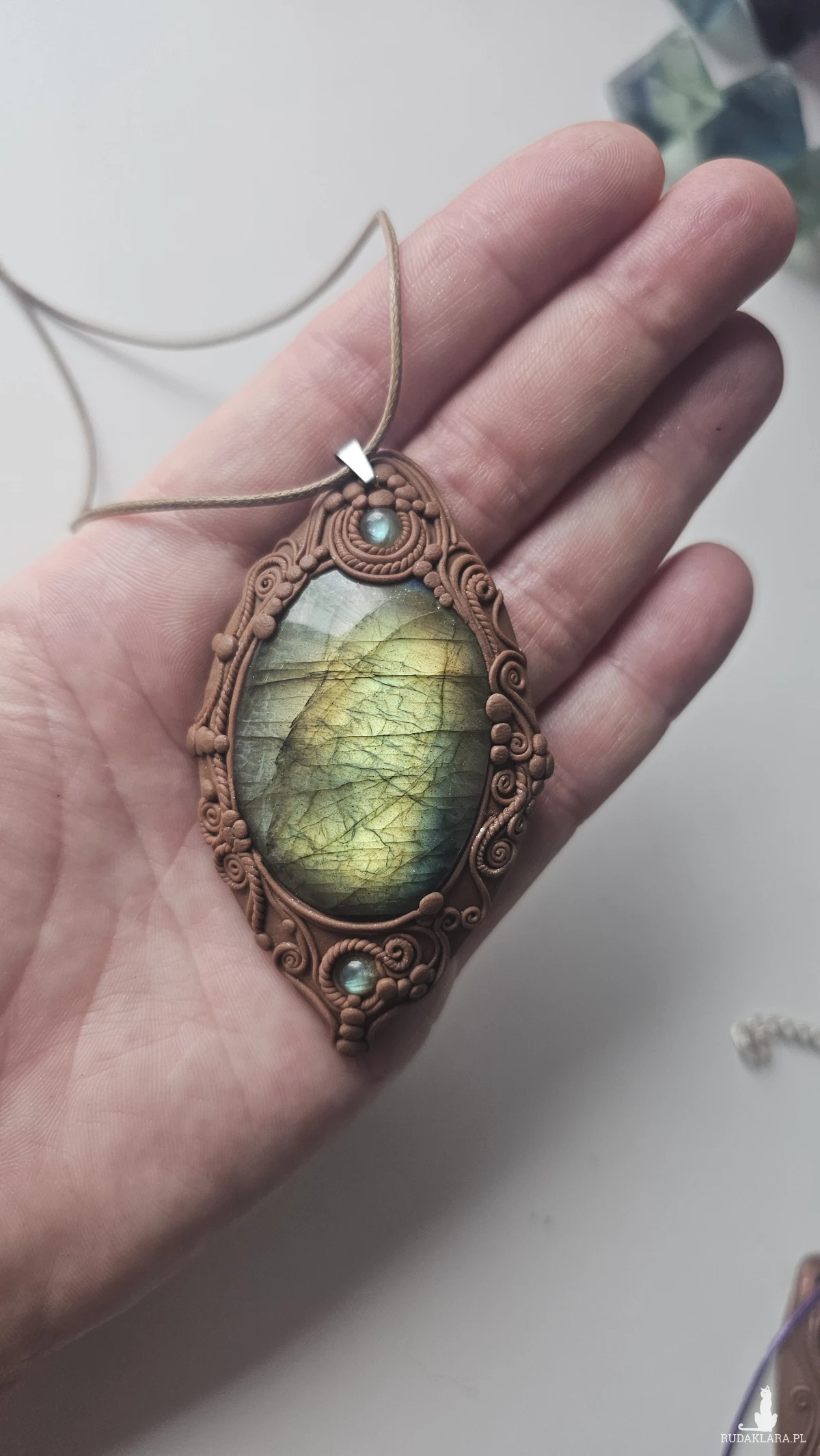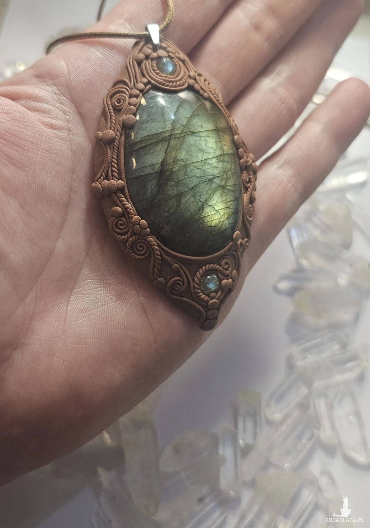 Wisior/naszyjnik/amulet/talizman wykonany misternie z gliny polimerowej. Ozdobiony filigranami, wzorami nawiązującymi do roślinnych pnączy, elfów czy do orientalnych wzorow. Wisiorek jest na sznurku o długości około 45 cm z zapięciem.