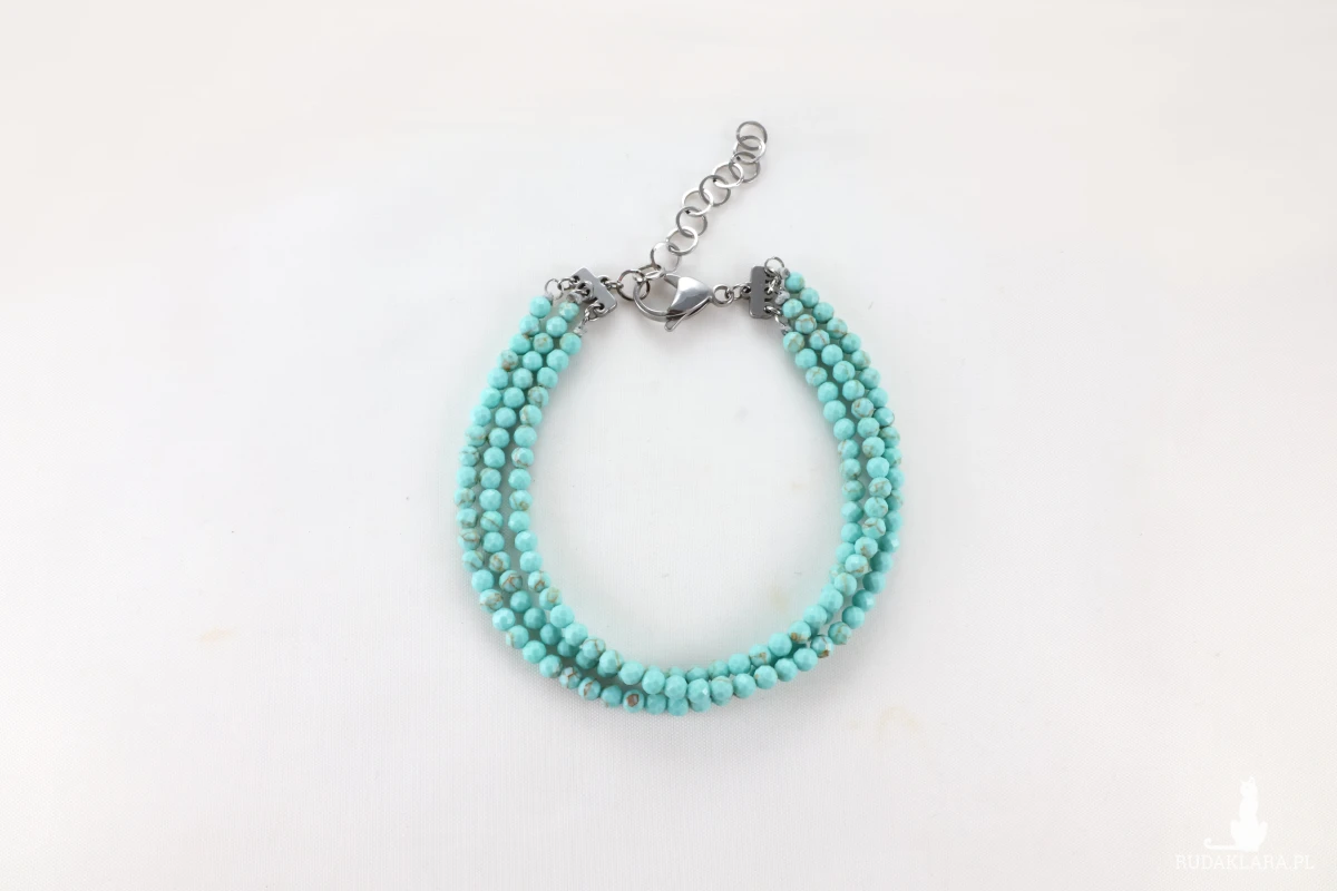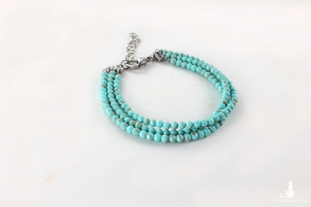 Bransoletka wykonana z trzech sznurów niebieskiego, fasetowanego magnezytu, który symbolizuje: harmonię, równowagę i spokój. Pomaga również redukować stres, napięcie i lęk. Jest kamieniem wspierającym rozwój duchowy i medytację, ponieważ sprzyja jasności umysłu, kreatywności i głębszemu zrozumieniu siebie. Wpływa również na poczucie bezpieczeństwa, wzmacnia intuicję i pomaga przezwyciężyć negatywne emocje. Doskonała na piękny prezent dla bliskiej osoby.