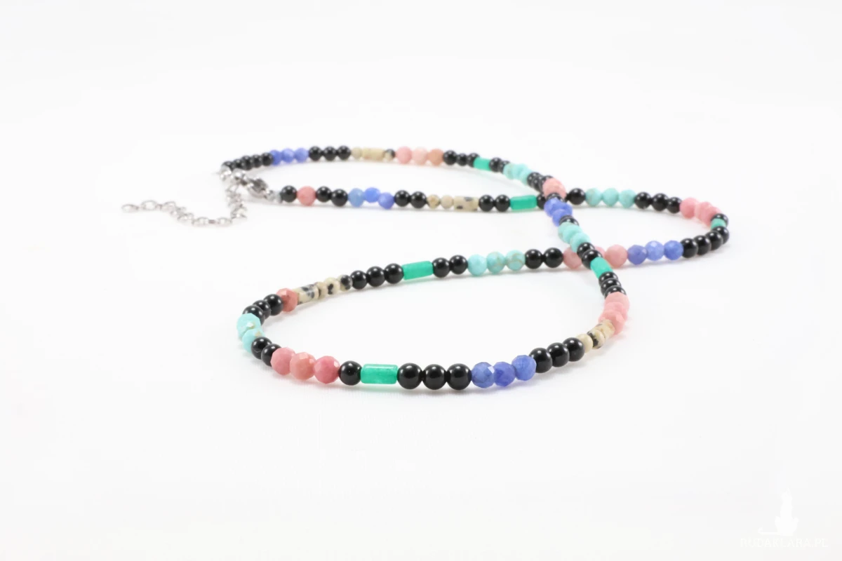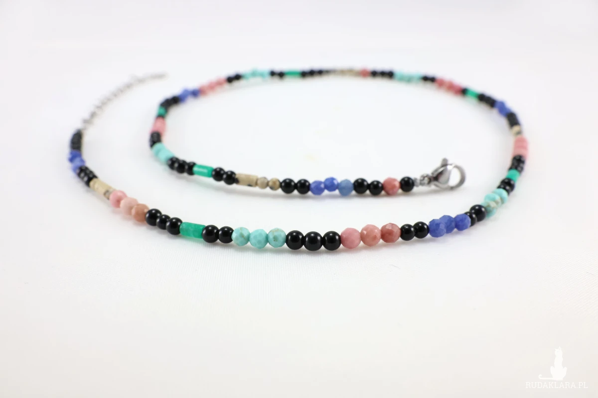 Unikatowy naszyjnik stworzony z mozaiki naturalnych kamieni szlachetnych. Ta biżuteria to idealny wybór dla osób, które cenią indywidualizm i chcą nosić przy sobie pełne spektrum pozytywnych wibracji. Radość i energia. Ten naszyjnik to prawdziwa paleta barw, skomponowana z drobnych, fasetowanych i gładkich koralików o różnych kształtach. Wśród kamieni znajdziesz m.in.: różowy rodonit, który symbolizuje miłość, równowagę i łagodność; magnezyt oznacza harmonię, równowagę i spokój; czarny onyks- siłę, stabilność, ochronę i wewnętrzną harmonię; akwamaryn- spokój, odwagę i jasność umysłu. Zielone koraliki: Symbolizują wzrost, odnowę i szczęście, a plamiste jaspisy wprowadzają stabilizację.
