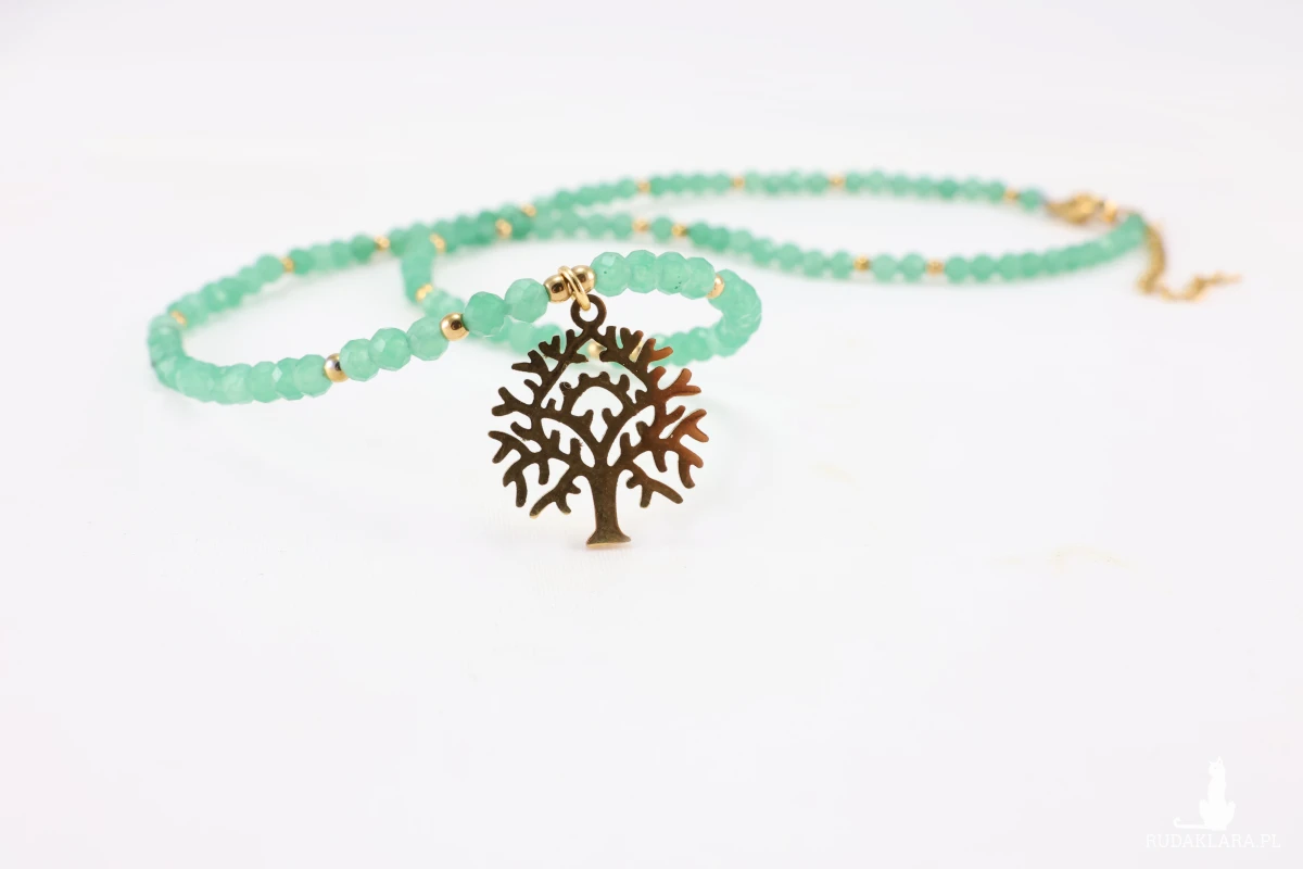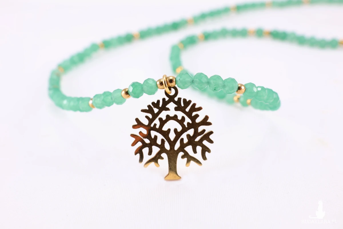 Odkryj harmonię natury i elegancji z tym wyjątkowym naszyjnikiem, który łączy w sobie głębokie znaczenie z subtelnym blaskiem. Naturalny, fasetowany Awenturyn w kolorze zieleni, znany jako kamień szczęścia, spokoju i dobrobytu. Stylowe, ażurowe Drzewo Życia - symbol siły, wzrostu, rodziny i połączenia ze światem. Wykonane ze stali chirurgicznej (nierdzewnej) w kolorze złotym, co zapewnia trwałość i hipoalergiczność. Drobne, złote koraliki ze stali chirurgicznej dodają blasku i rozdzielają zielone kamienie, tworząc elegancki rytm. Idealny dodatek do stylizacji casualowych i boho, ale też jako dyskretny, kolorowy akcent do bardziej formalnego ubioru.