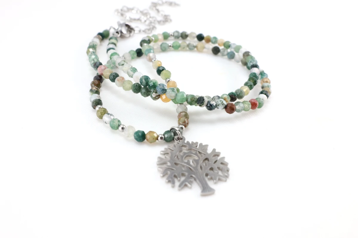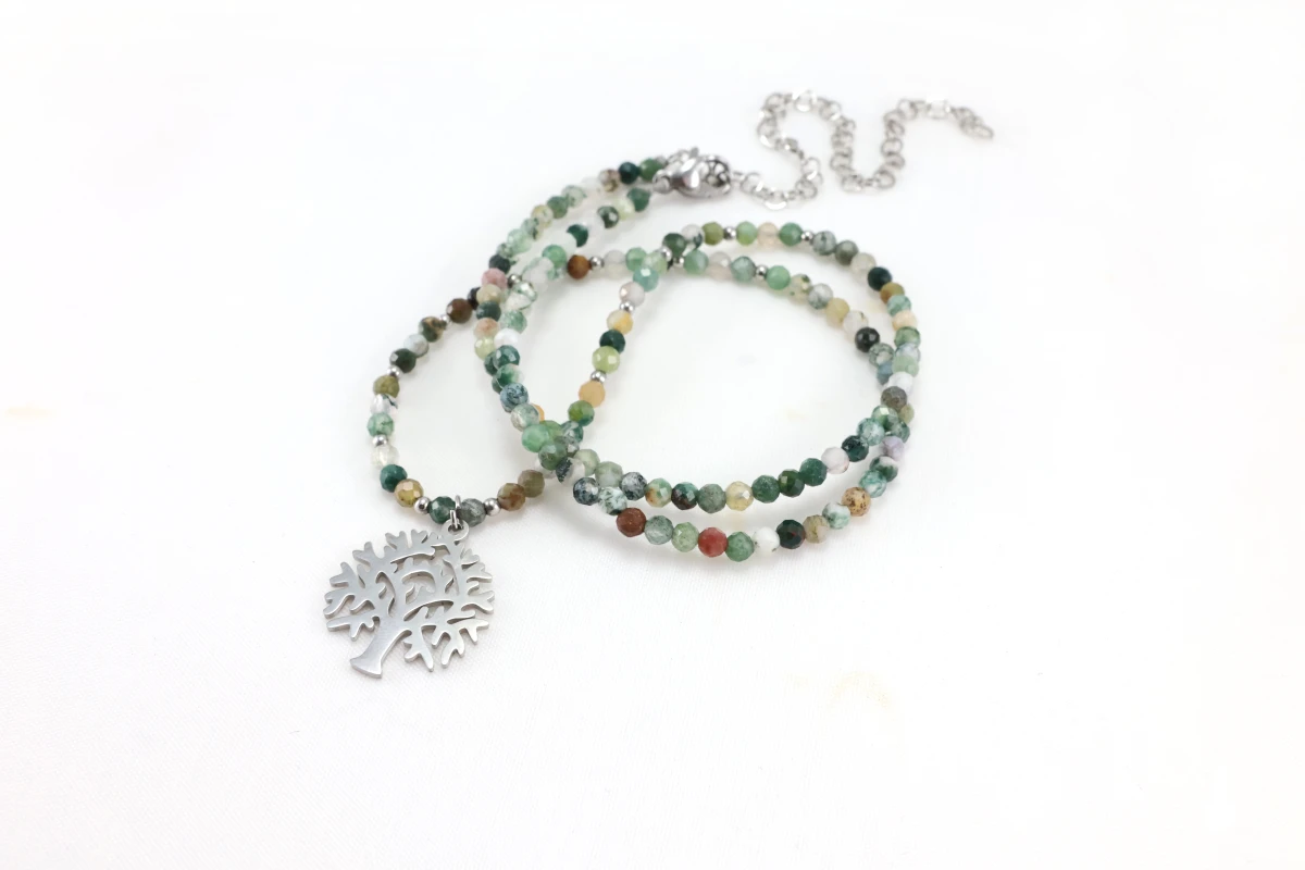 Szukasz biżuterii, która łączy piękno natury z głęboką symboliką? Oto idealny naszyjnik dla Ciebie! Drobne, fasetowane koraliki to naturalny Agat indyjski – każdy kamień jest unikatowy i wygląda jak mała, leśna mikrokraina w odcieniach zieleni, bieli i brązu. Agat indyjski jest kamieniem spokoju, odnowy i uzdrawiania. Jego energia wspiera równowagę i pomaga połączyć się z naturą. Wisiorek Drzewo Życia ze stali chirurgicznej symbolizuje siłę, wzrost, rodzinę i nieustanne odradzanie się. Jego srebrny kolor idealnie pasuje do naturalnych barw kamieni.