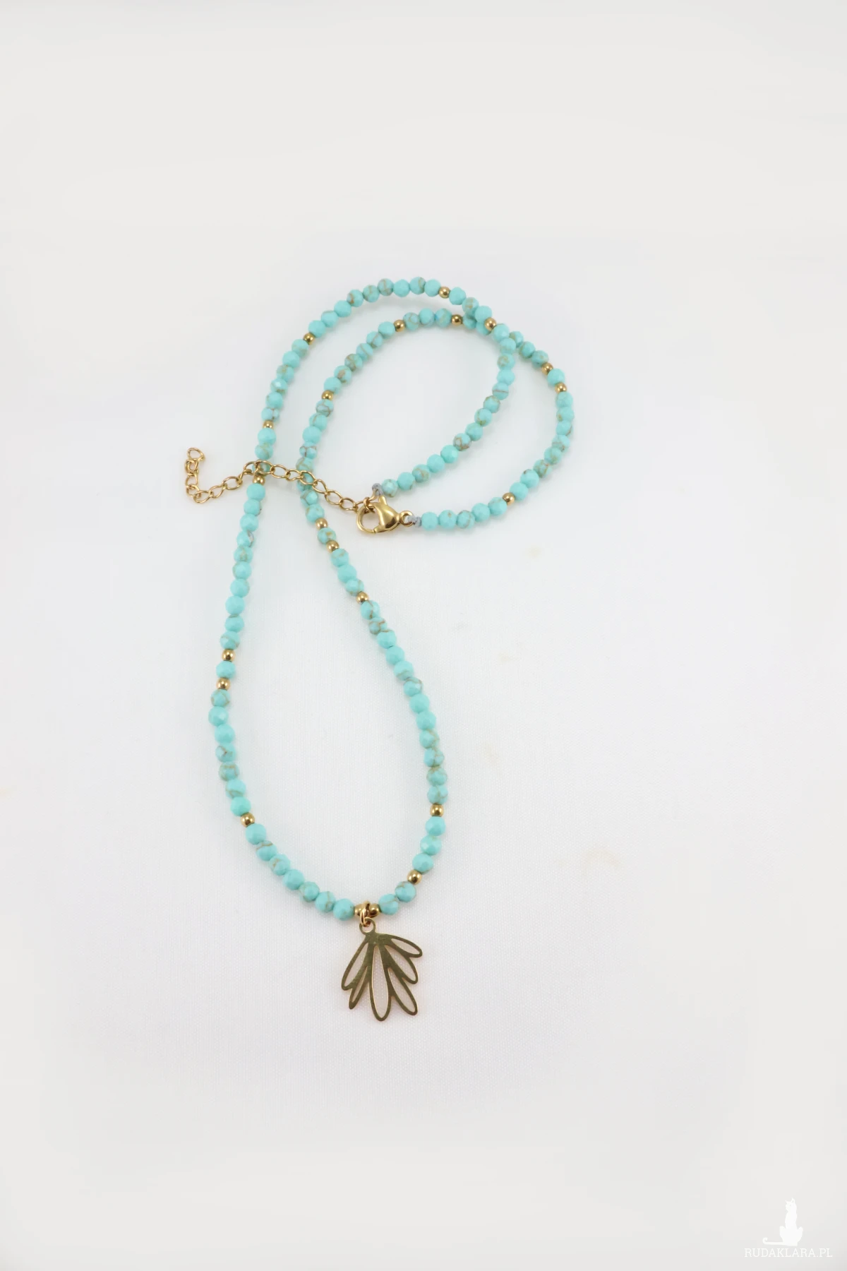 Ten naszyjnik to esencja błękitnego nieba i głębokiego morza, zamknięta w misternych, fasetowanych koralikach. Magnezyt, znany jako kamień ciszy i relaksu, działa jak Twój osobisty, noszony przy sobie, amulet spokoju. Subtelny, złoty liść wykonany ze stali chirurgicznej, pięknie prezentuje się przy dekolcie, symbolizując odradzanie się i piękno prostej natury.