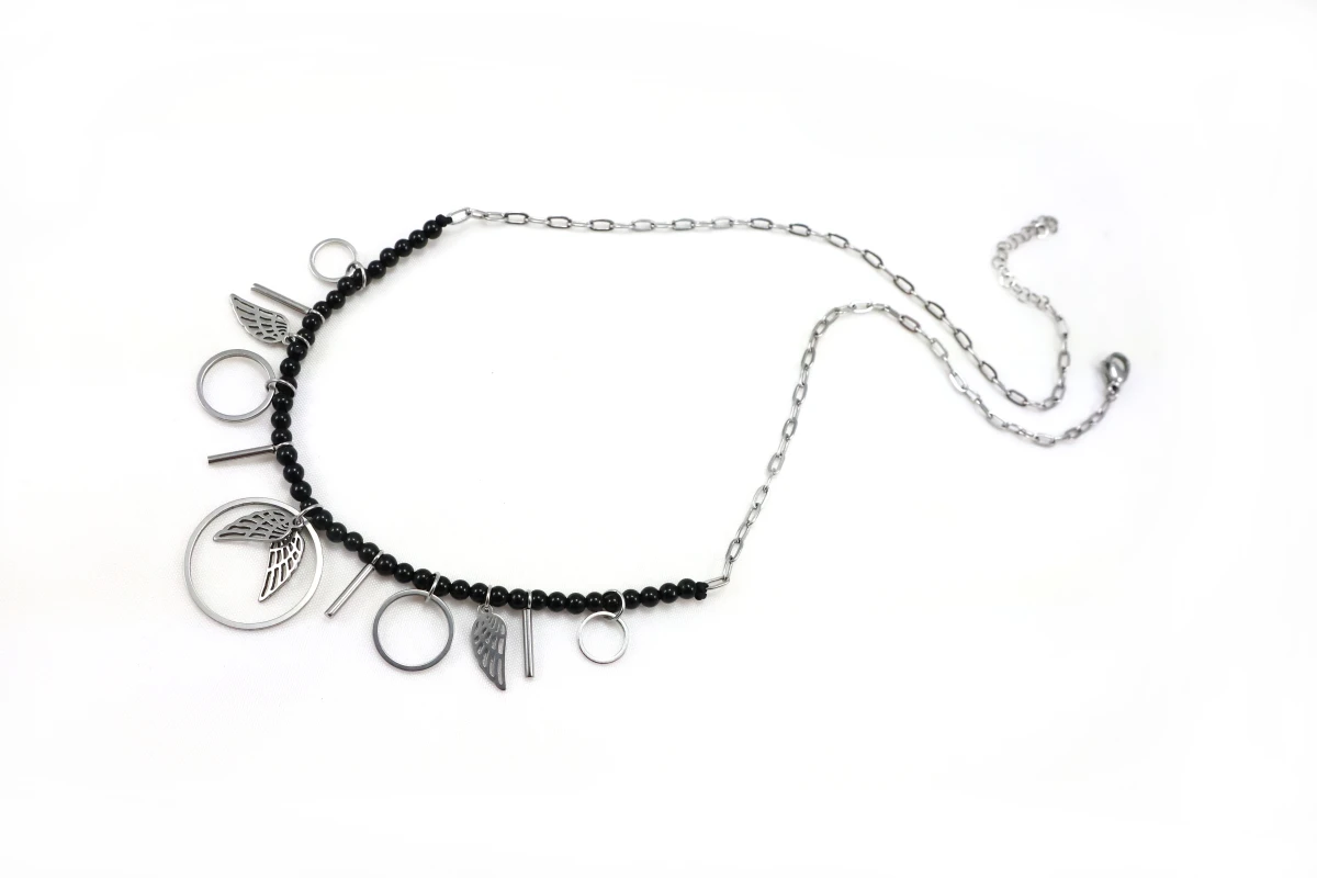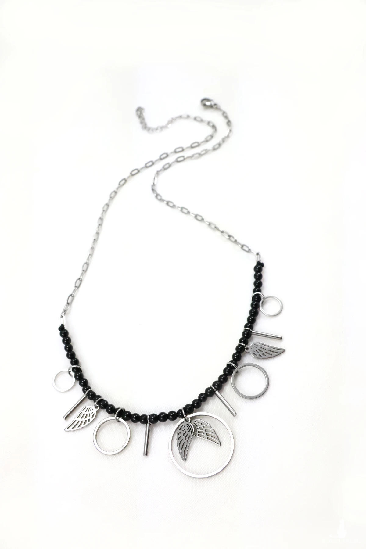 Wyrazisty naszyjnik ze skrzydłami i onyksem. Efektownie łączy ze sobą głęboką czerń onyksu z subtelnymi, metalowymi zawieszkami. Kamienie onyksu słyną ze swoich właściwości dodających pewności siebie, siły i ochrony przed negatywną energią. Zawieszki w kształcie skrzydeł stanowią uniwersalny symbol wolności, lekkości i duchowej ochrony.