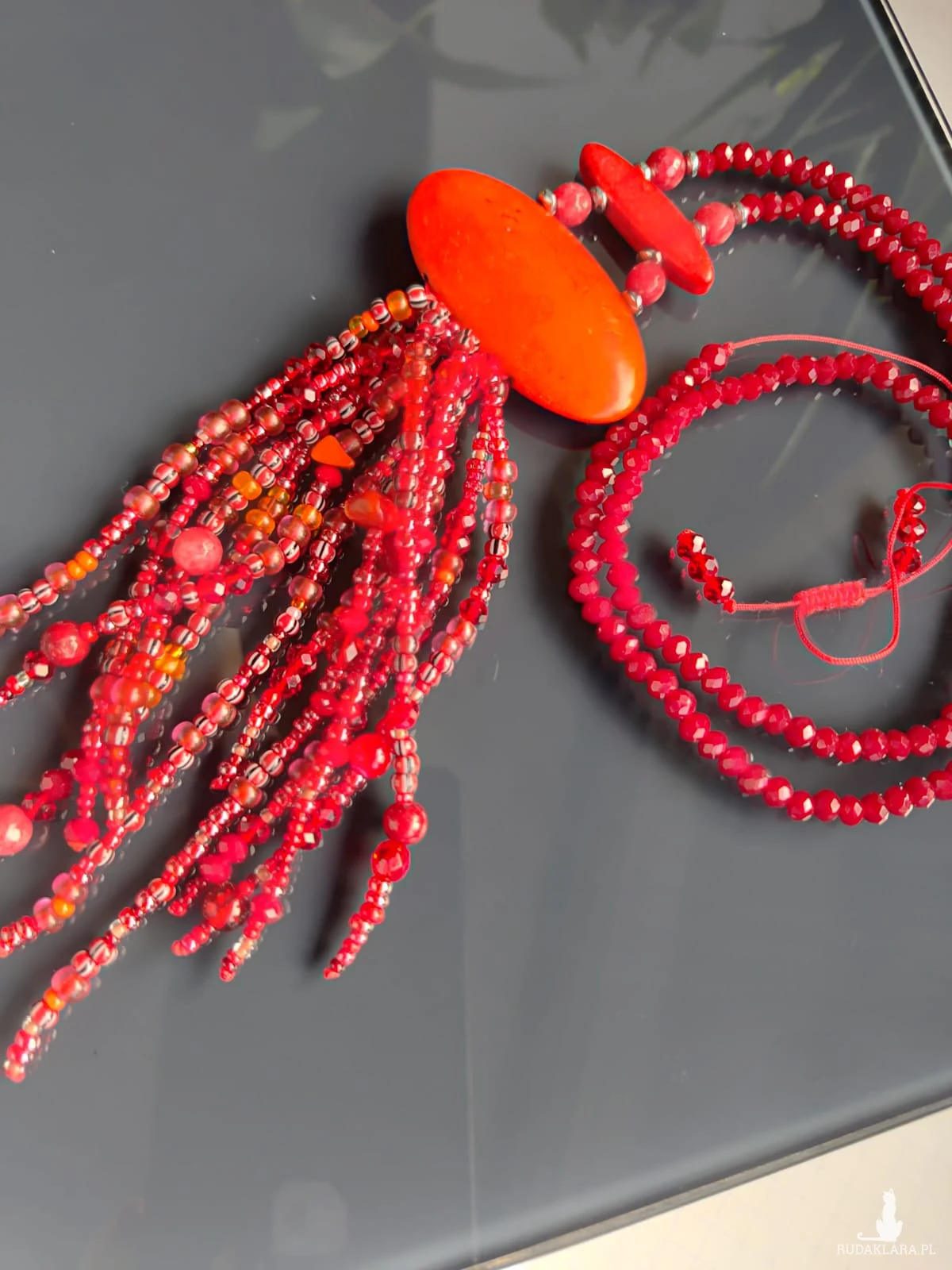 Naszyjnik Długi Sznur Czerwonych Korali Z Frędzlami