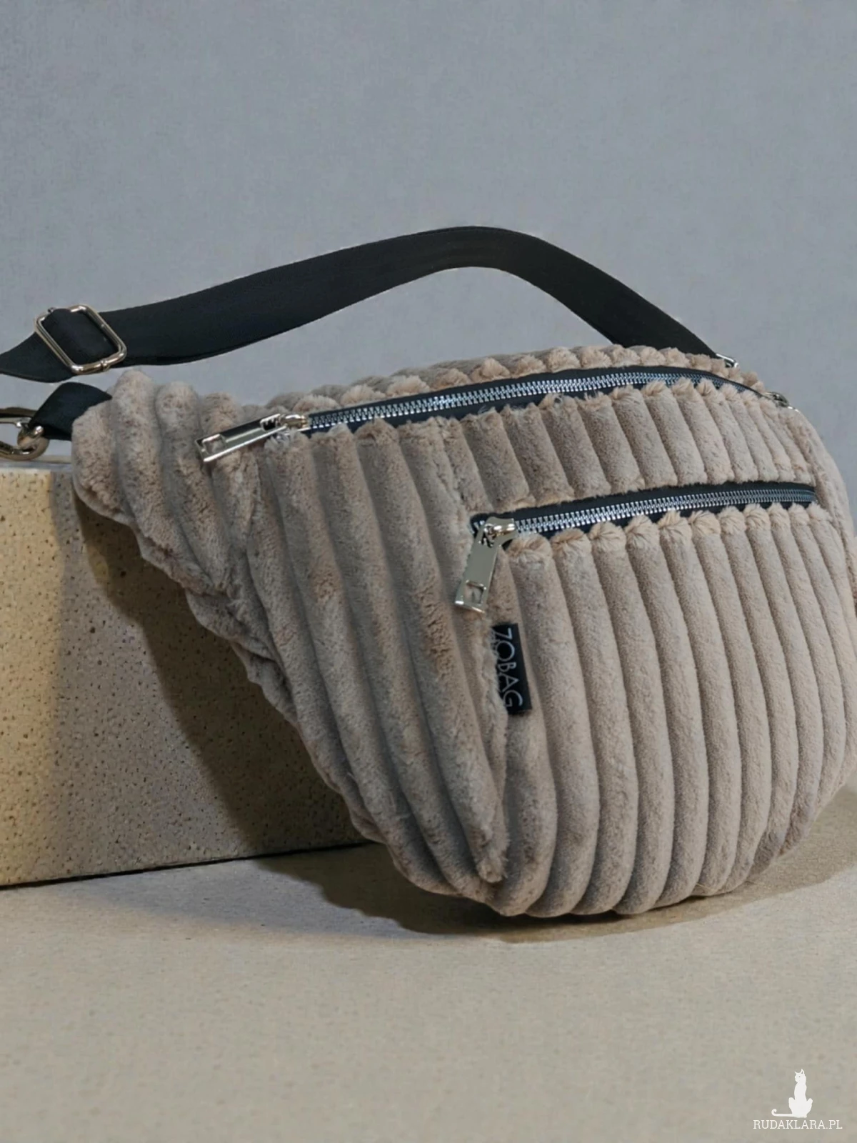 Jest to duża nerka do noszenia przez ramię, bardzo pojemna. Posiada na przodzie kieszeń na zamek na telefon, klucze. W środku jedna duża komora z jedną kieszenią na zamek.