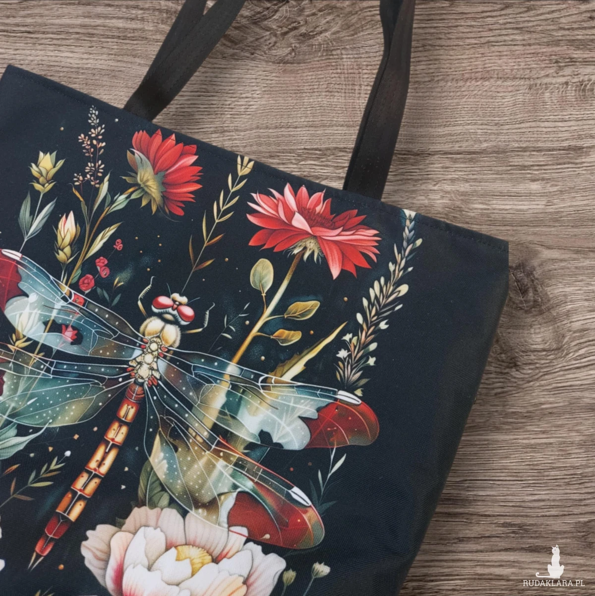 Na przodzie torby znajduje się panel wodoodporny z ważką. Tył torby to czarna, pikowana tkanina wodoodporna. Rączki posiada z czarnej taśmy nośnej do noszenia na ramieniu.
