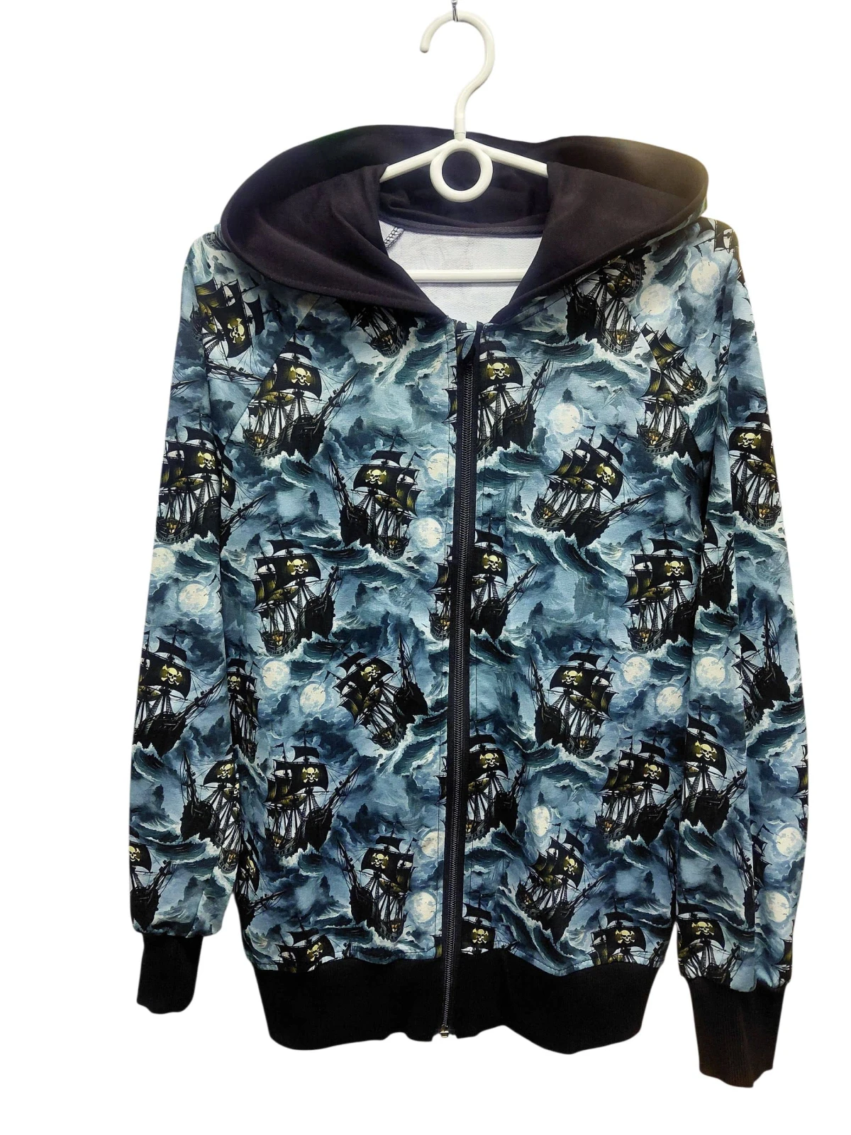 Bluza rozpinana z kapturem, uszyta z dresówki pętelki, wzór cyfrowy.