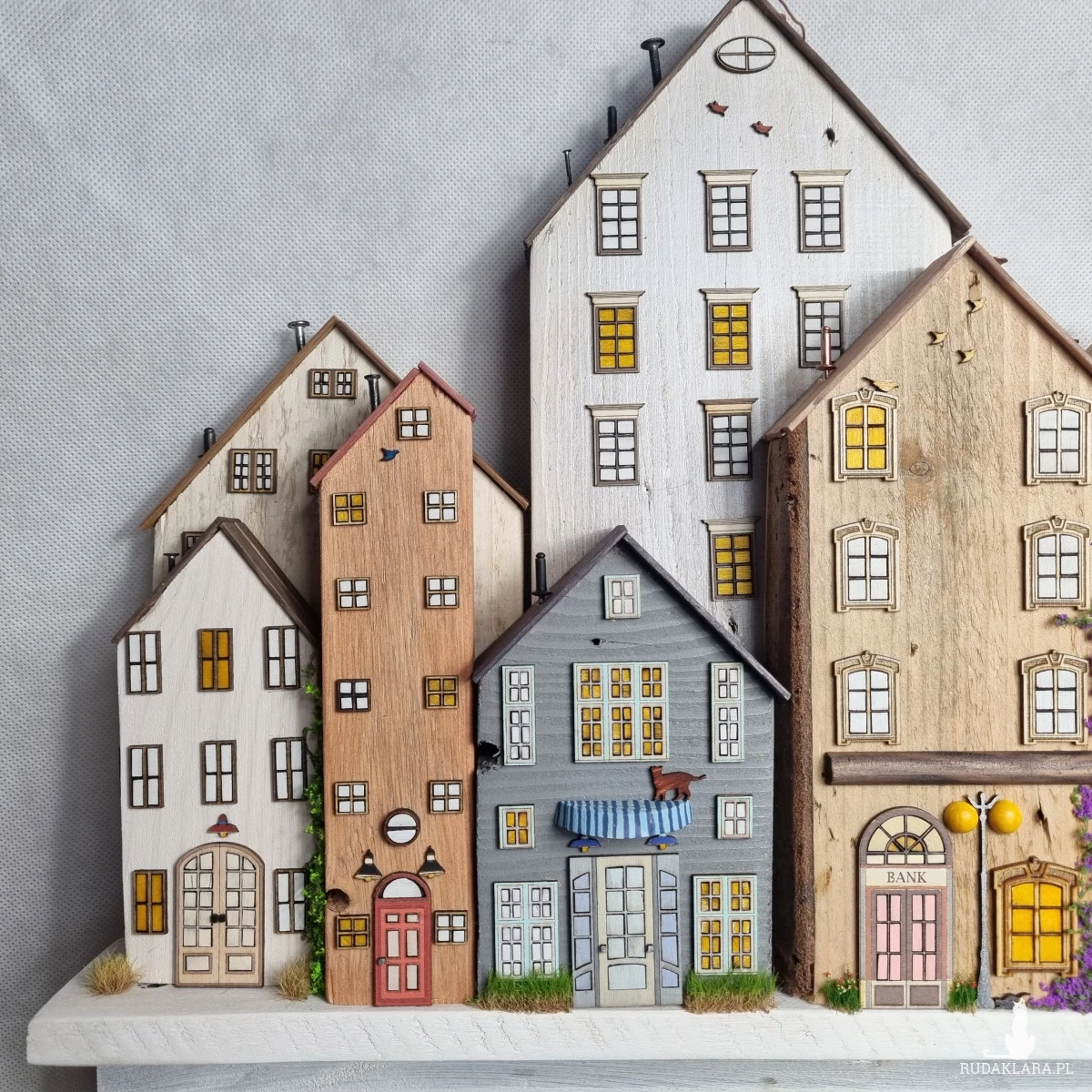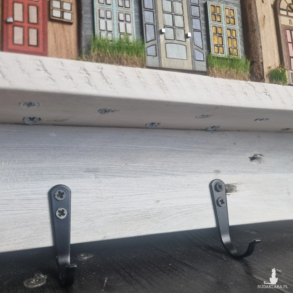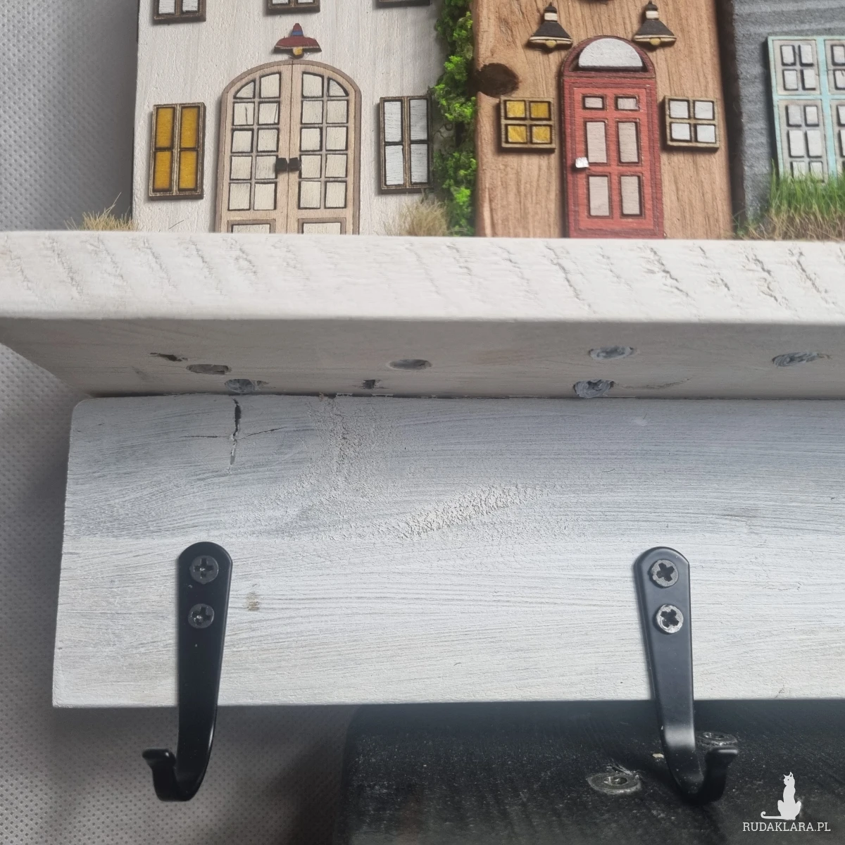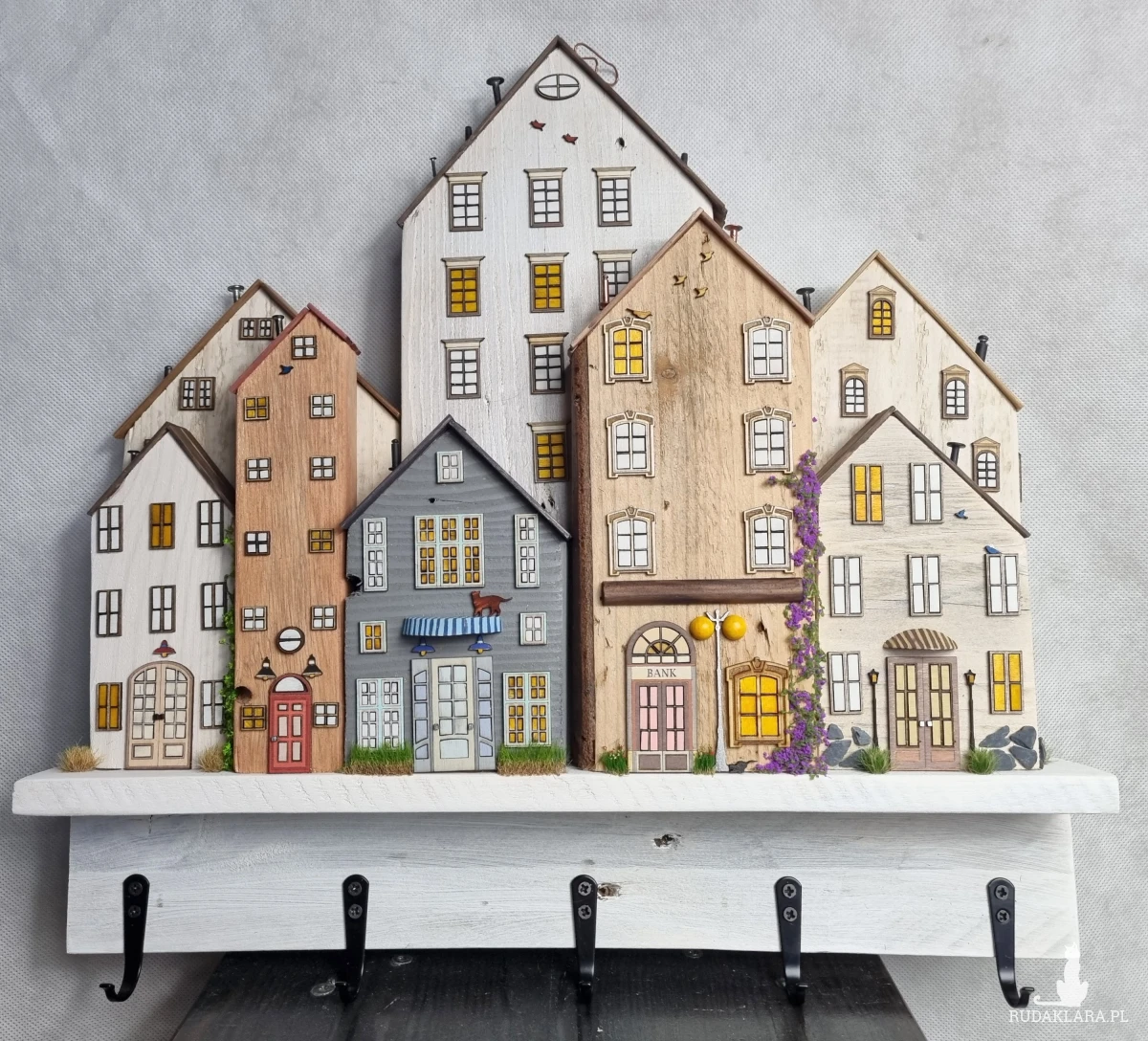 Drewniane domki handmade, mogące służyć jako wieszak na klucze (5), ręczniki inne drobiazgi. Domki wykonane desek ze starych palet z odzysku. Drewno bejcowane, woskowane, malowane w różnych odcieniach - ładnie podkreślające starość drewna - malowane bezbarwną farbą akrylową. Drewniane, wycinane okna i drzwi, również inne detale. Długość 44 cm, wysokość 44 cm, szerokość 7 cm . Całość do zawieszenia na ścianie na 2 hakach. (14)