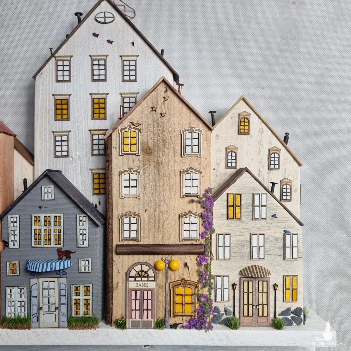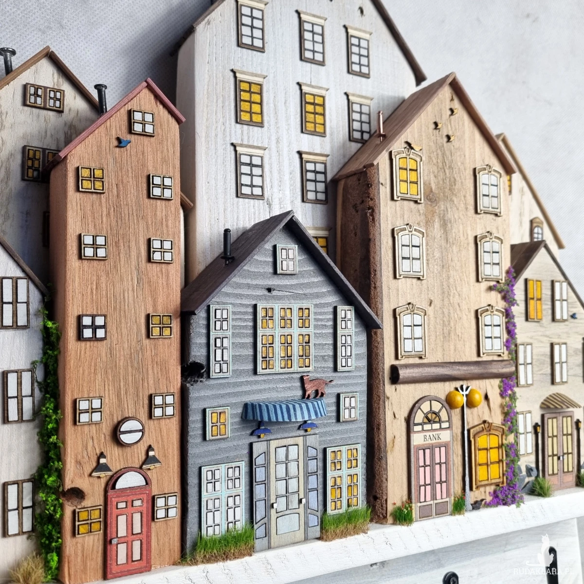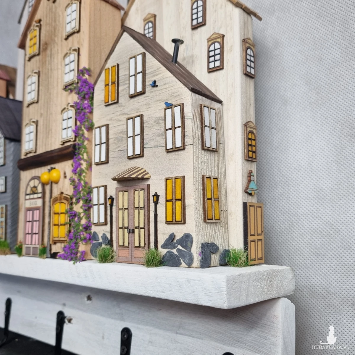 Drewniane domki handmade, mogące służyć jako wieszak na klucze (5), ręczniki inne drobiazgi. Domki wykonane desek ze starych palet z odzysku. Drewno bejcowane, woskowane, malowane w różnych odcieniach - ładnie podkreślające starość drewna - malowane bezbarwną farbą akrylową. Drewniane, wycinane okna i drzwi, również inne detale. Długość 44 cm, wysokość 44 cm, szerokość 7 cm . Całość do zawieszenia na ścianie na 2 hakach. (14)
