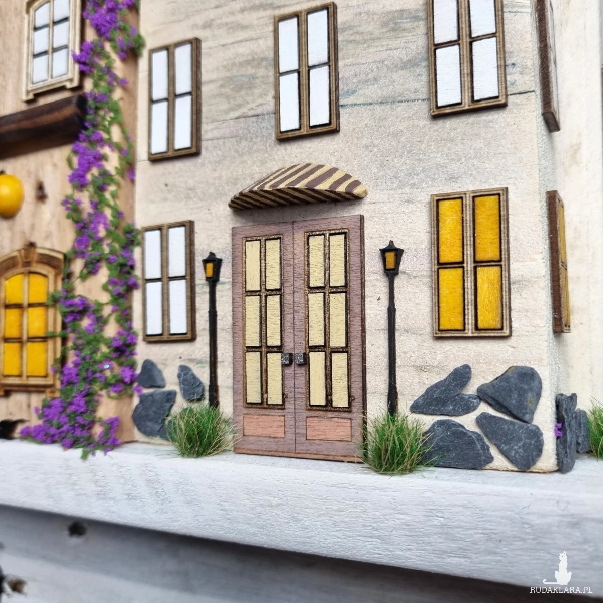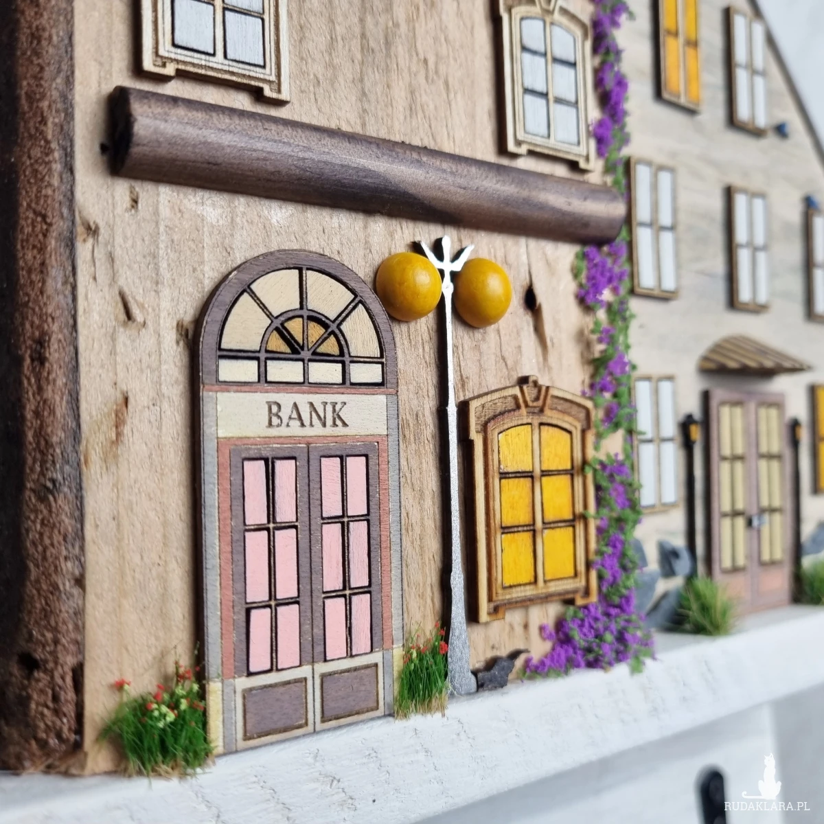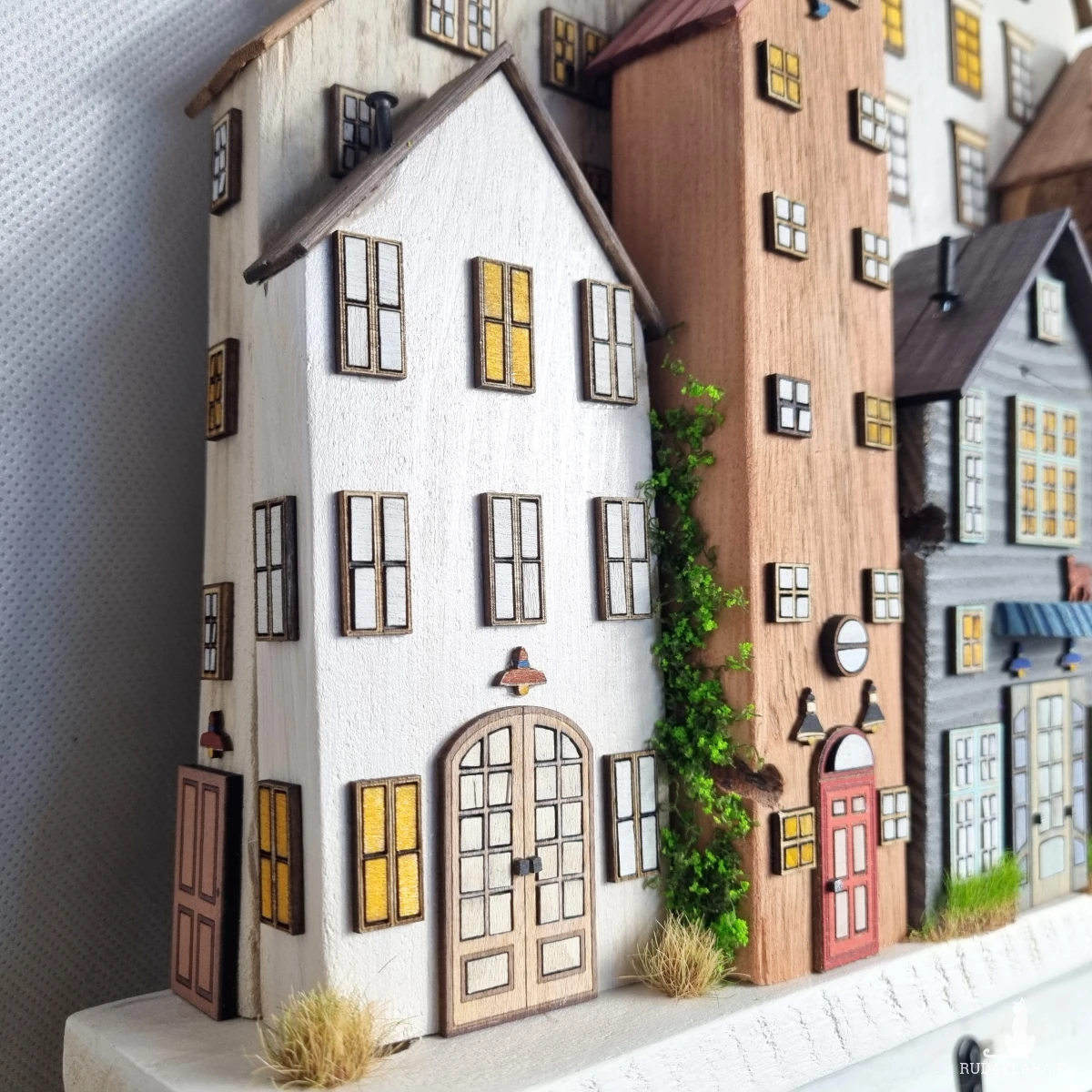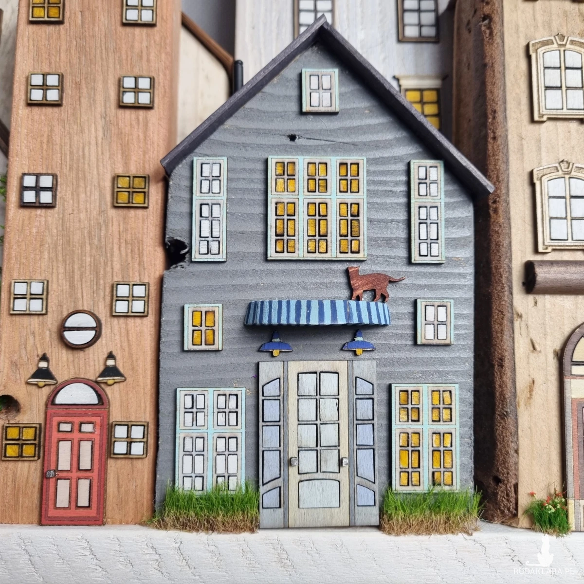Drewniane domki handmade, mogące służyć jako wieszak na klucze (5), ręczniki inne drobiazgi. Domki wykonane desek ze starych palet z odzysku. Drewno bejcowane, woskowane, malowane w różnych odcieniach - ładnie podkreślające starość drewna - malowane bezbarwną farbą akrylową. Drewniane, wycinane okna i drzwi, również inne detale. Długość 44 cm, wysokość 44 cm, szerokość 7 cm . Całość do zawieszenia na ścianie na 2 hakach. (14)