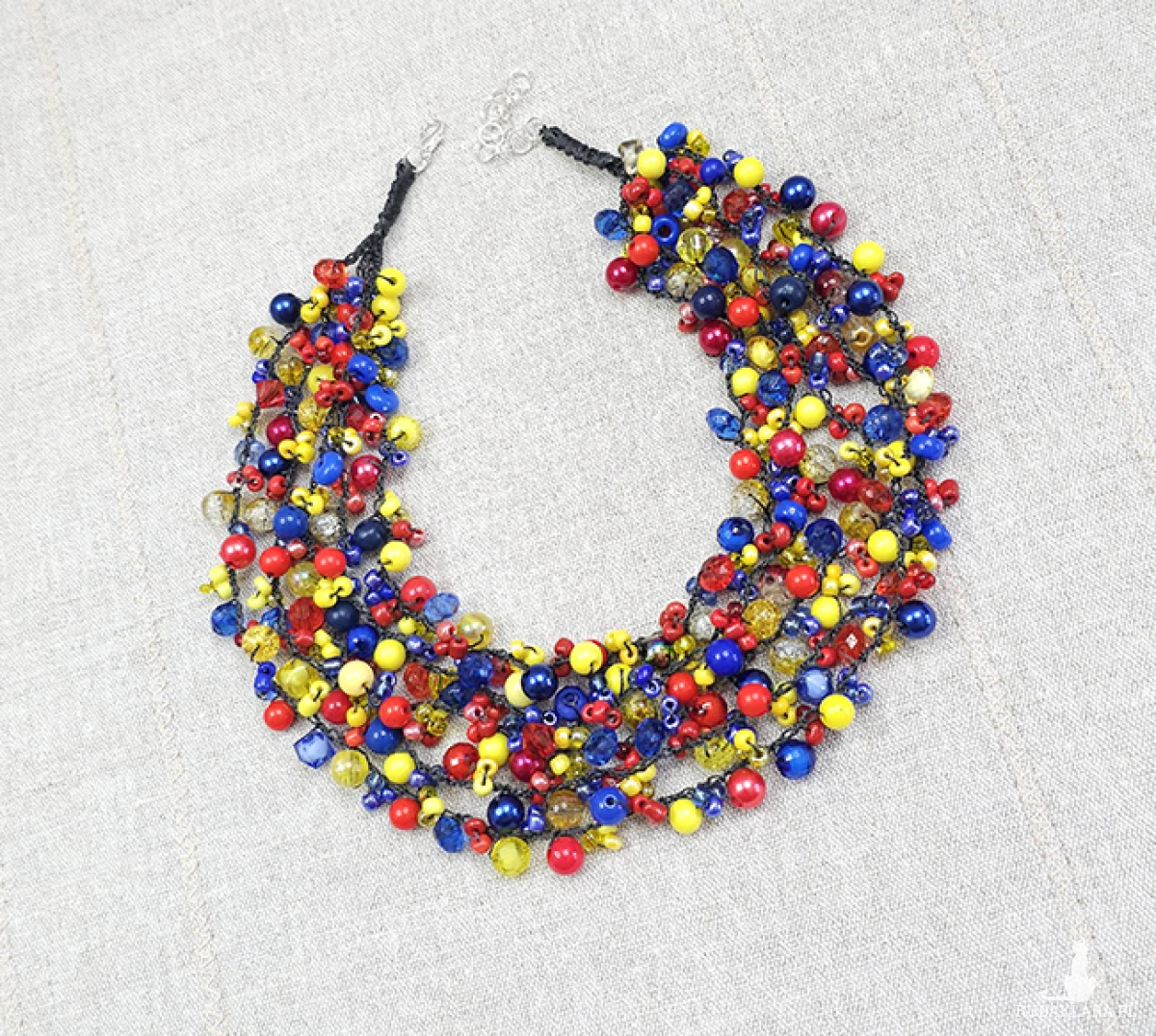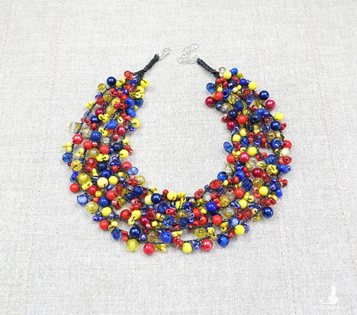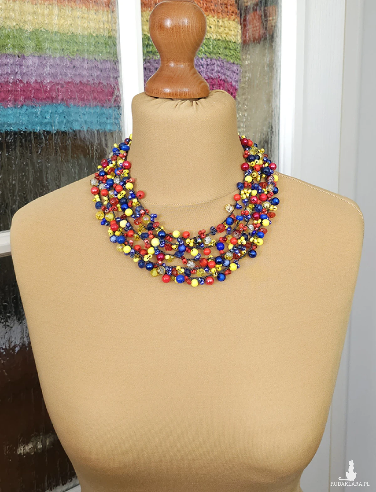 Ten wielorzędowy naszyjnik z koralików to prawdziwa eksplozja barw! Połączenie intensywnej czerwieni, głębokiego granatu/kobaltu i słonecznej żółci sprawia, że jest to idealny dodatek, by ożywić każdą stylizację – od prostego T-shirtu po elegancką, ale stonowaną sukienkę.