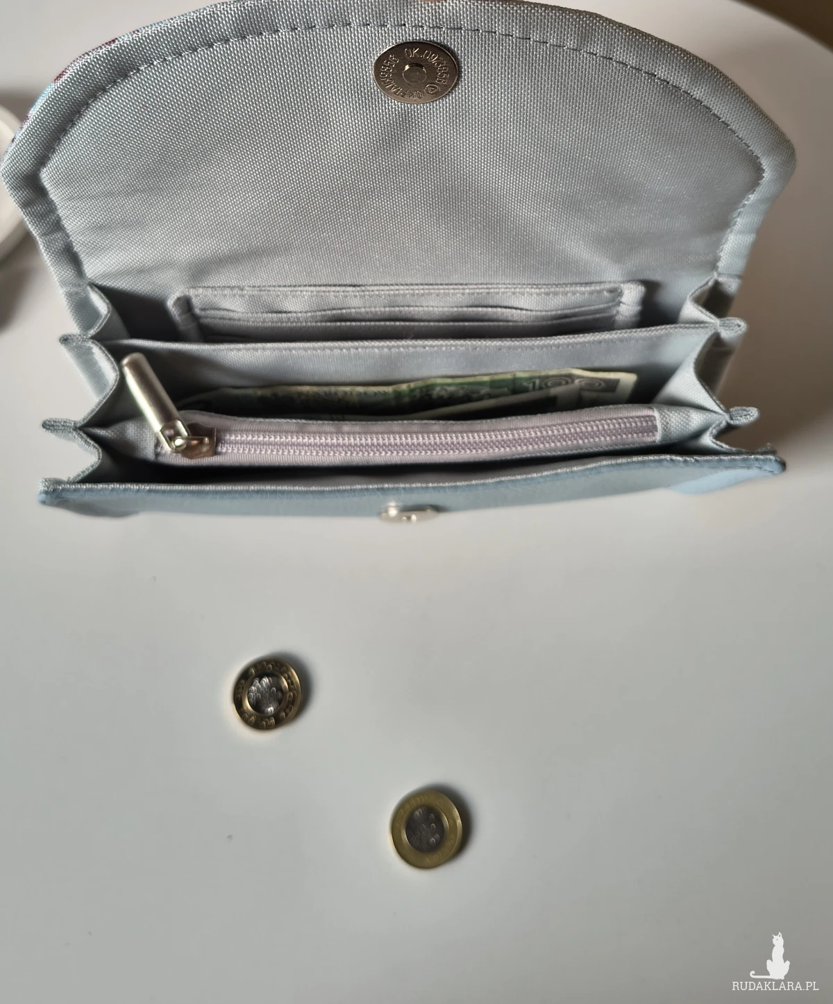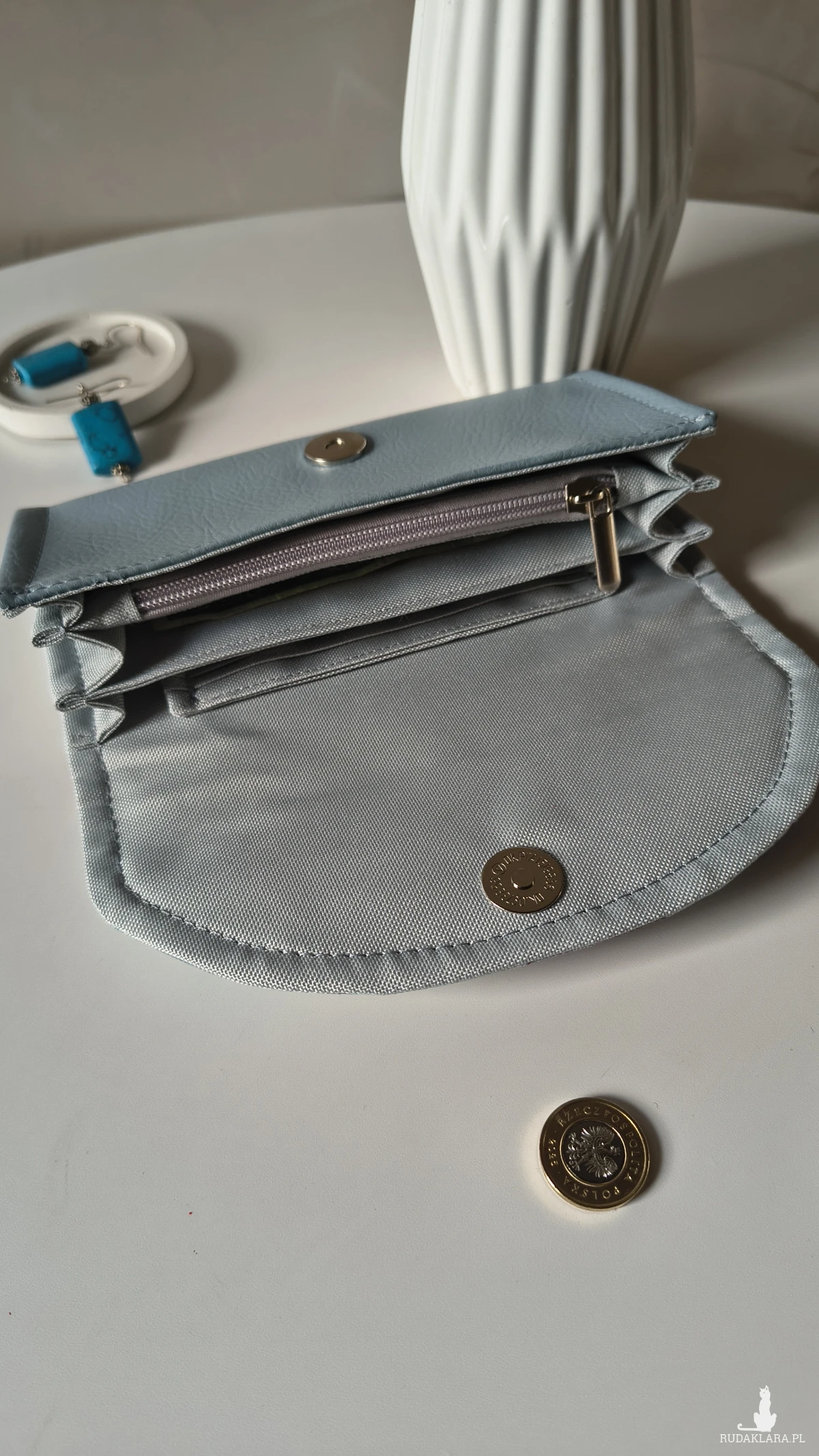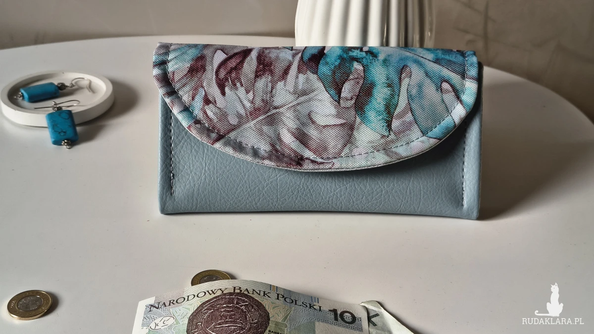 Przedstawiam duży portfel w kolorze brudnego błękitu, Wykonany z ekoskóry oraz materiału wodoodpornego w liście monstery..