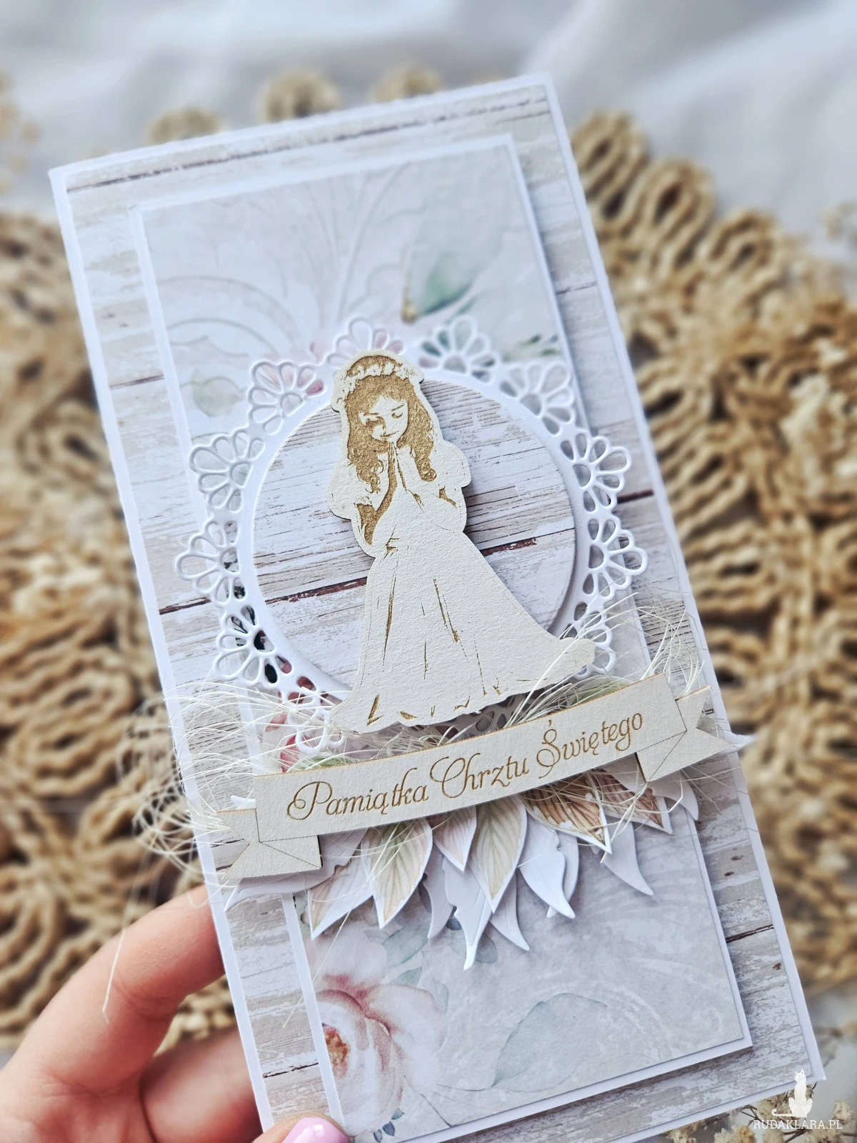 Kartka oklejona papierami z nadrukiem w kolorze beżpowym. Na froncie sylwetka dziwczynki na drewienku oraz napis. Jako dodatki elementy papierowe.