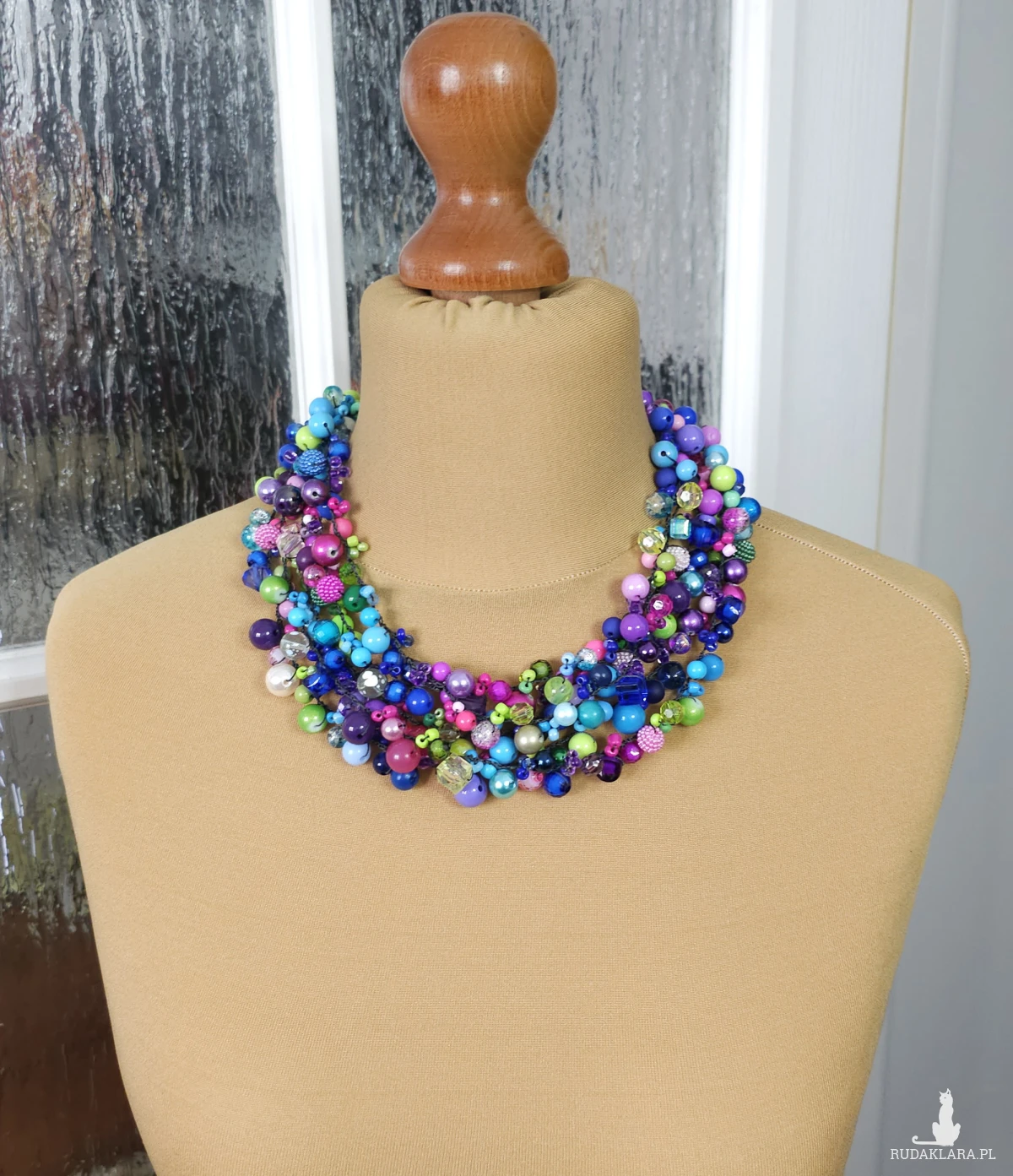 Ten ręcznie wykonany naszyjnik to harmonijne połączenie intensywnych barw i różnorodnych tekstur.