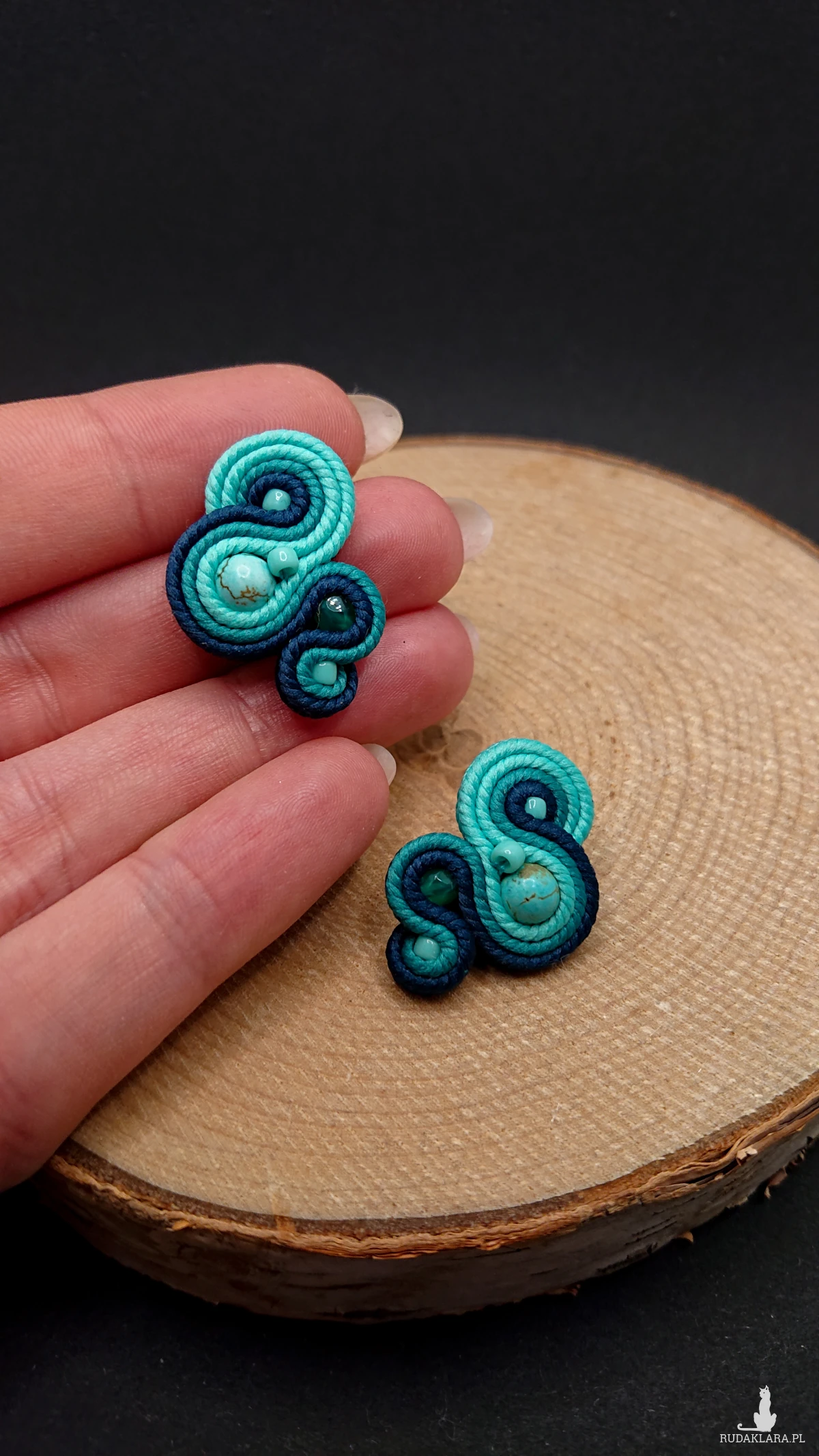 Niewielkie kolczyki sutasz wykonane z szklanych koralików oraz polskich sznurków sutasz. Kolory w kolczykach: turkusowy, morski. Kolczyki zamocowane na sztyftach ze stali chirurgicznej.