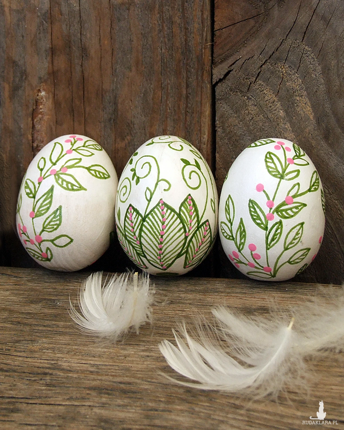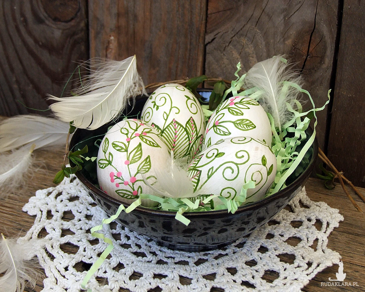 Pisanki są malowane farbami akrylowymi, kontury wykonane są pisakiem permamentnym. Całość zabezpieczona jest lakierem akrylowym - to jest nietoksyczny, bezzapachowy i matowy lakier. Jeśli pisanki się zabrudzą, wystarczy przetrzeć je wilgotną ściereczką - farba jest wodoodporna.