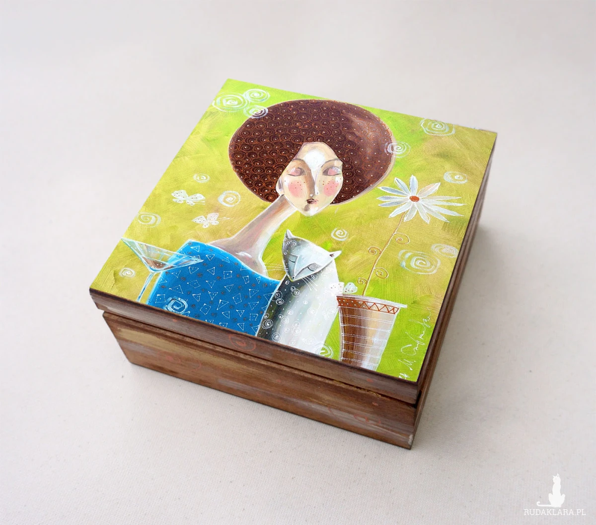 Drewniane pudełko na różności z reprodukcją obrazu autorskiego, noszącego tytuł „Chwila spokojnej melancholii”. Reprodukcja umieszczona jest metodą decoupage na wierzchniej części, boki szkatułki natomiast malowane są ręcznie, a całość zabezpieczona jest bezbarwnym lakierem oraz sygnowana w środku.