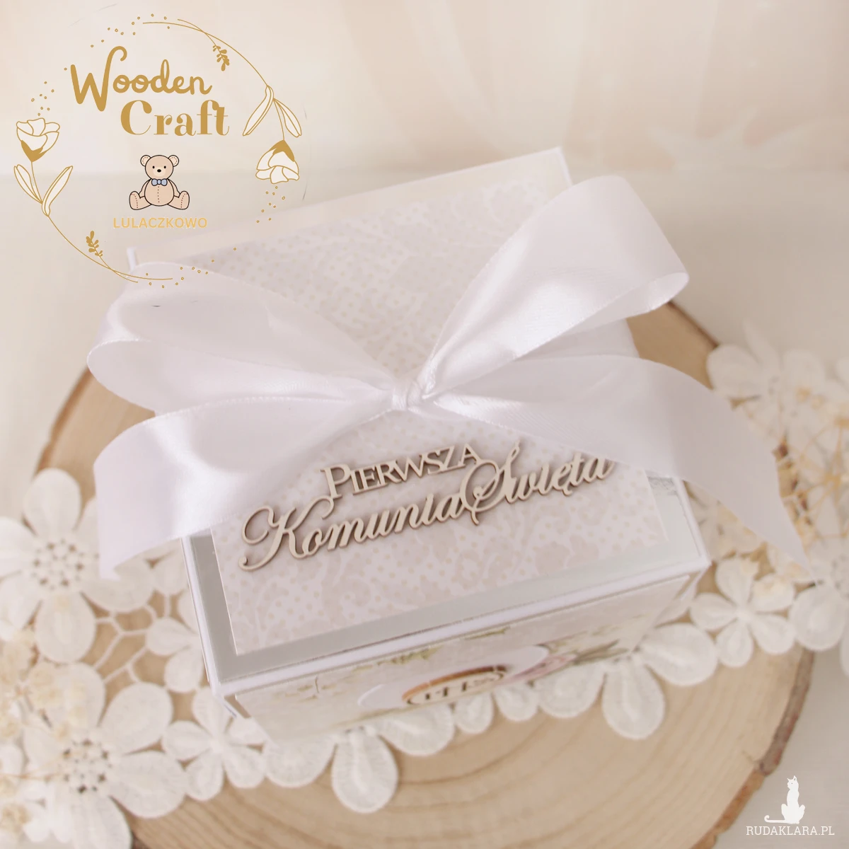 Wieczko boxa zdobi biała kokarda oraz tekturkowy napis "Pierwsza Komunia Święta" (do napisu mogę dodać również imię dziecka oraz datę uroczystości).