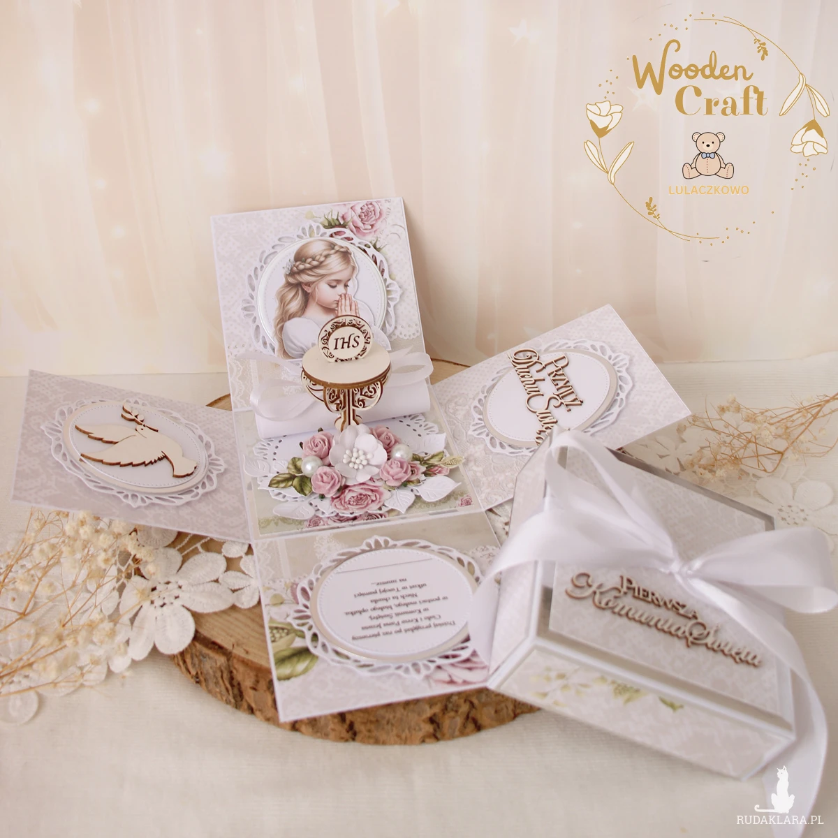 Wewnątrz boxa znalazła się, przepiękna tekturka 3D kielich z hostią świętą, otoczony kompozycją kwiatową. Na ściankach boxa umieszczona została grafika modlącej się dziewczynki komunijnej, tekturka gołębicy oraz cytat "Przyjdź Duchu Święty", a także życzenia. Za tekturką 3D umieszczona została wstążeczka, którą można przewiązać zwinięte w rulonik banknoty.