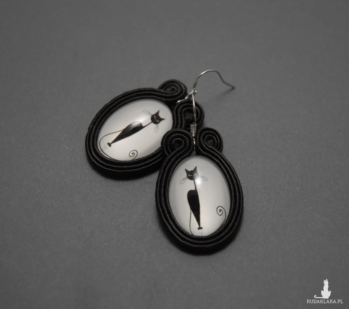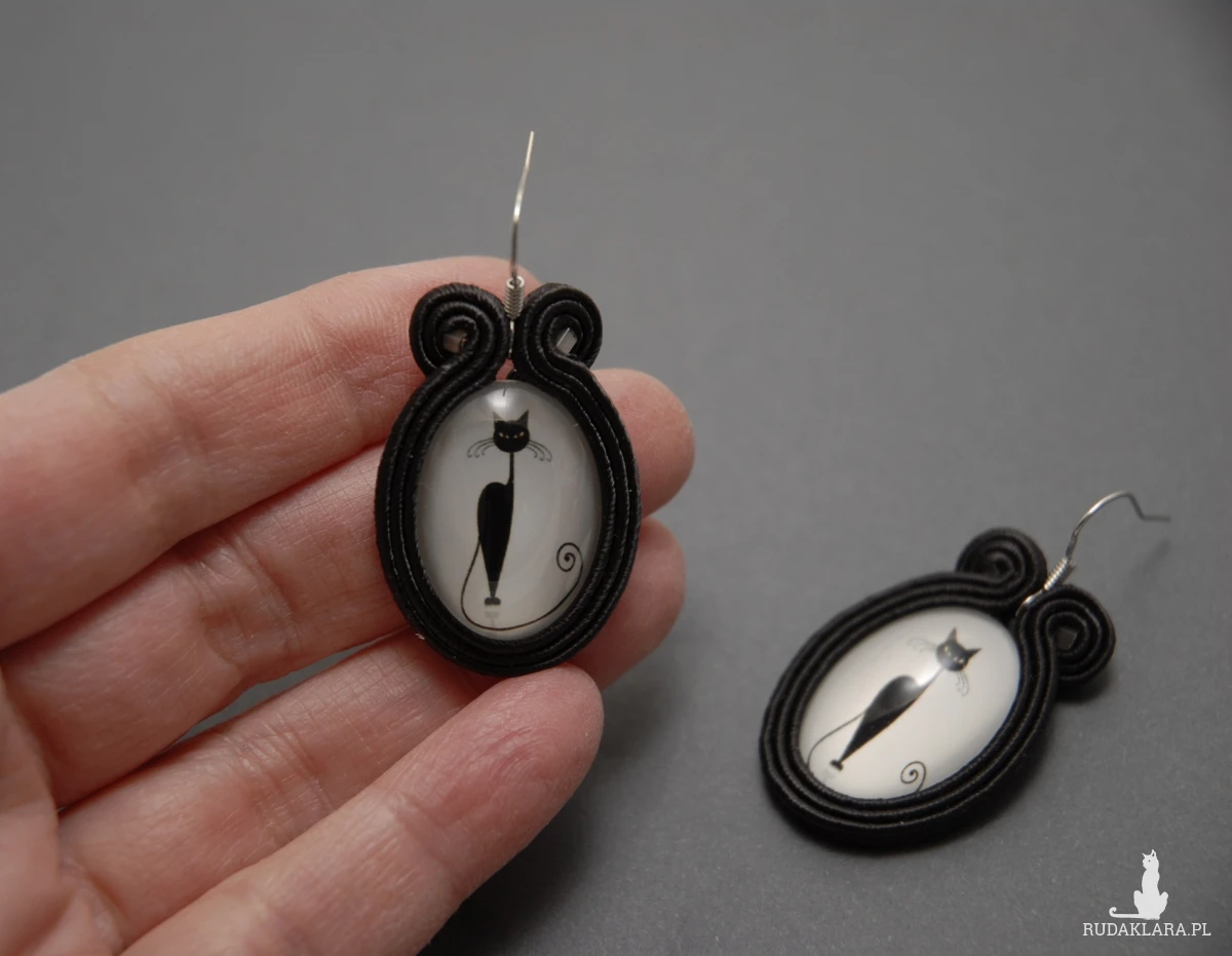 oferuję kolczyki zrobione techniką sutasz, ozdobione kaboszonami z wizerunkiem kota
