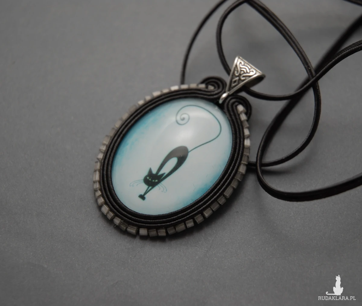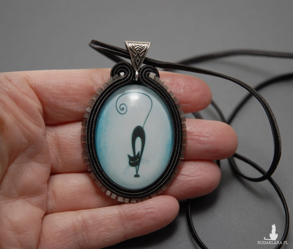 oferuję wisiorek zrobiony techniką sutasz, ozdobiony kaboszonem z kotem i koralikami