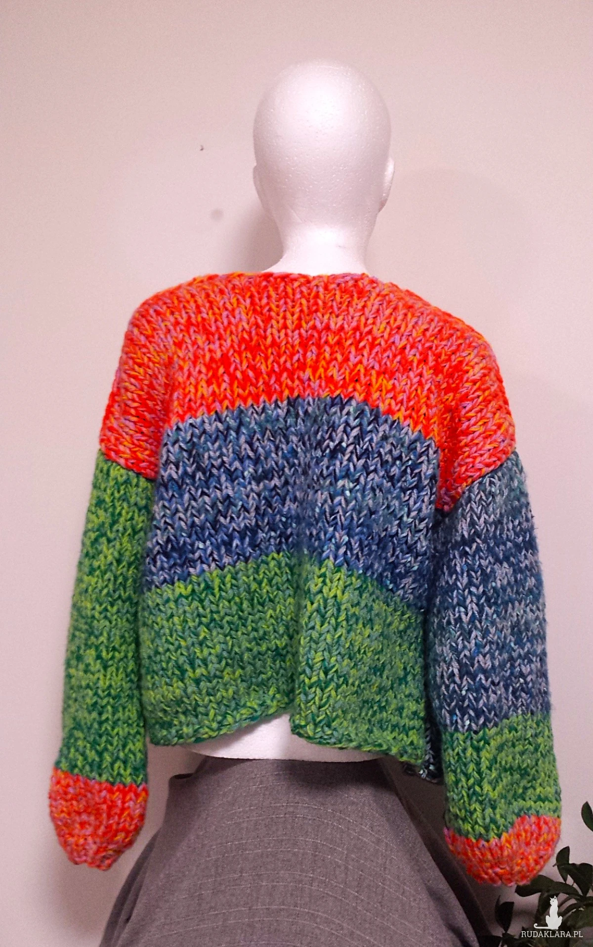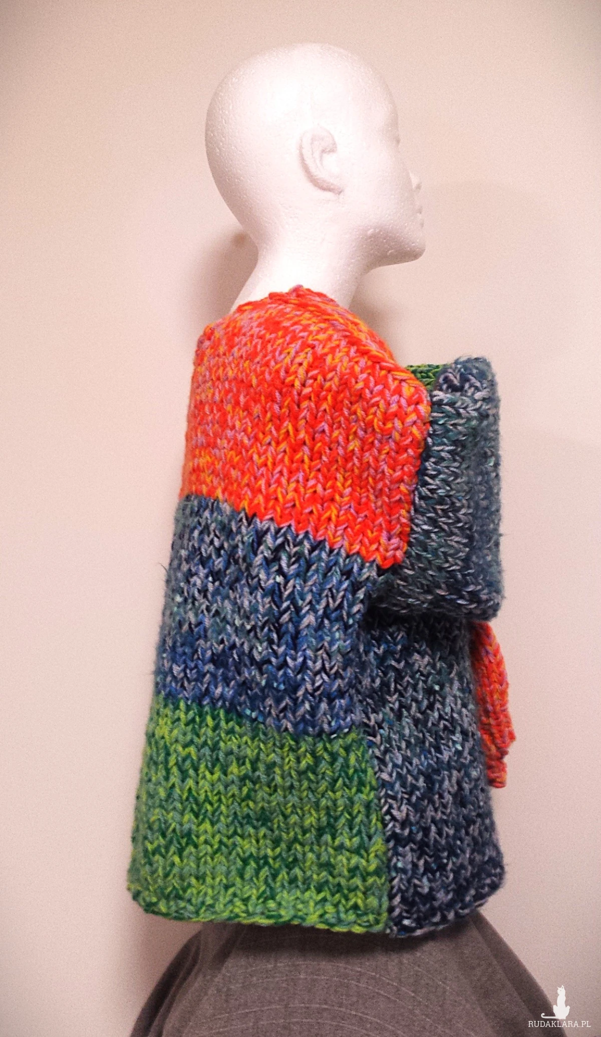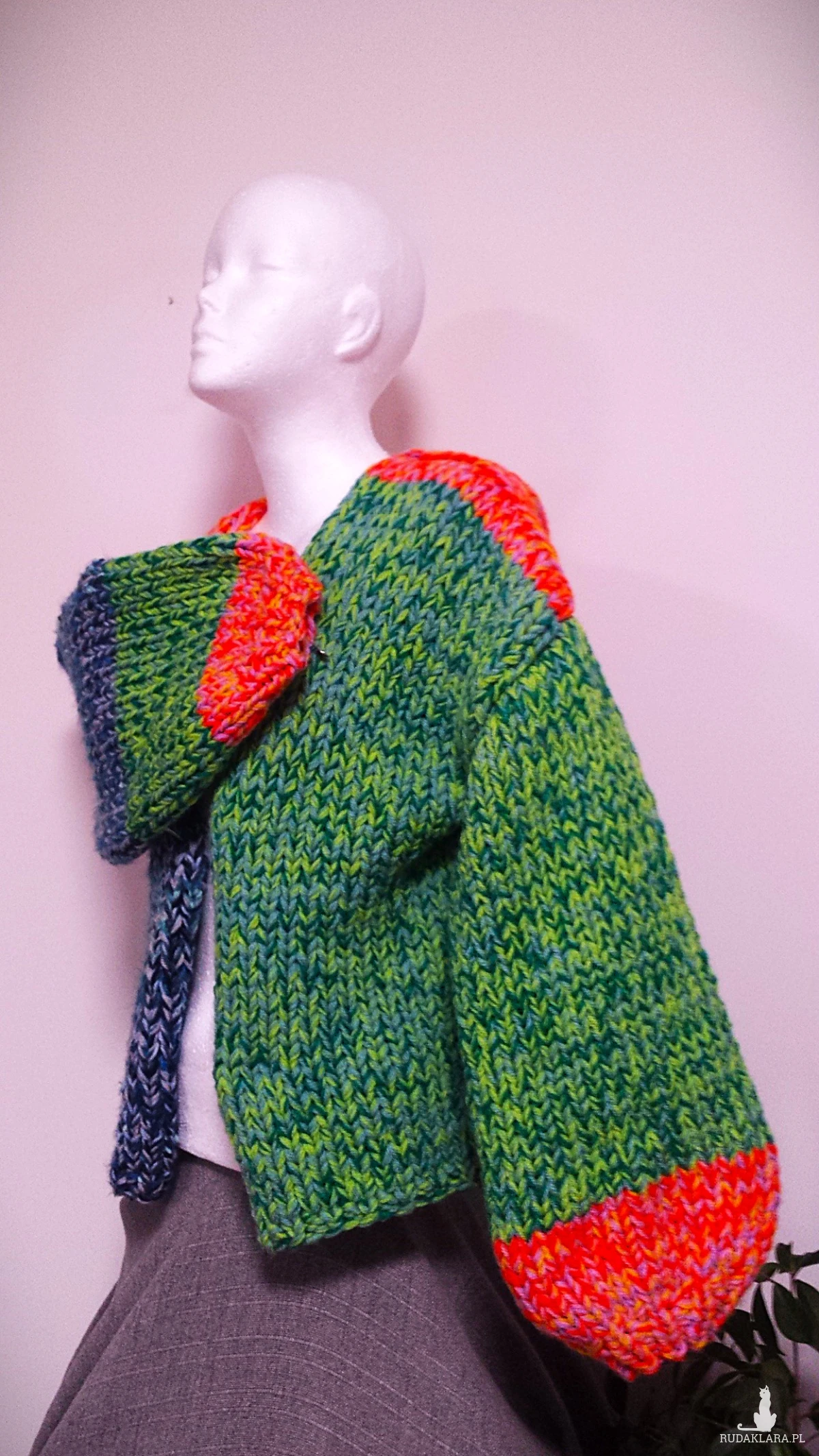 Oryginalny, praktyczny prezent dla Ciebie lub bliskiej osoby*** Kolorowy, krótki kardigan. Bardzo ciepły, robiony z poczwórnej miękkiej włóczki akrylowej. Rozmiar uniwersalny (36-40). Możliwość wykonania w różnych wersjach kolorystycznych i rozmiarach, na zamówienie (czas wykonania 10 dni). Inne fasony na pozostałych moich aukcjach.