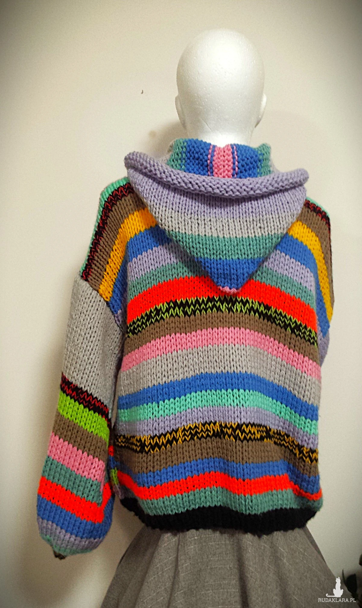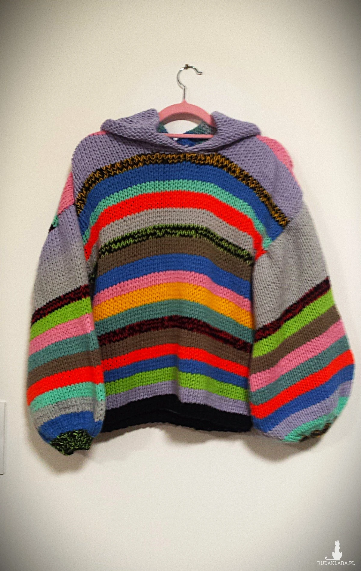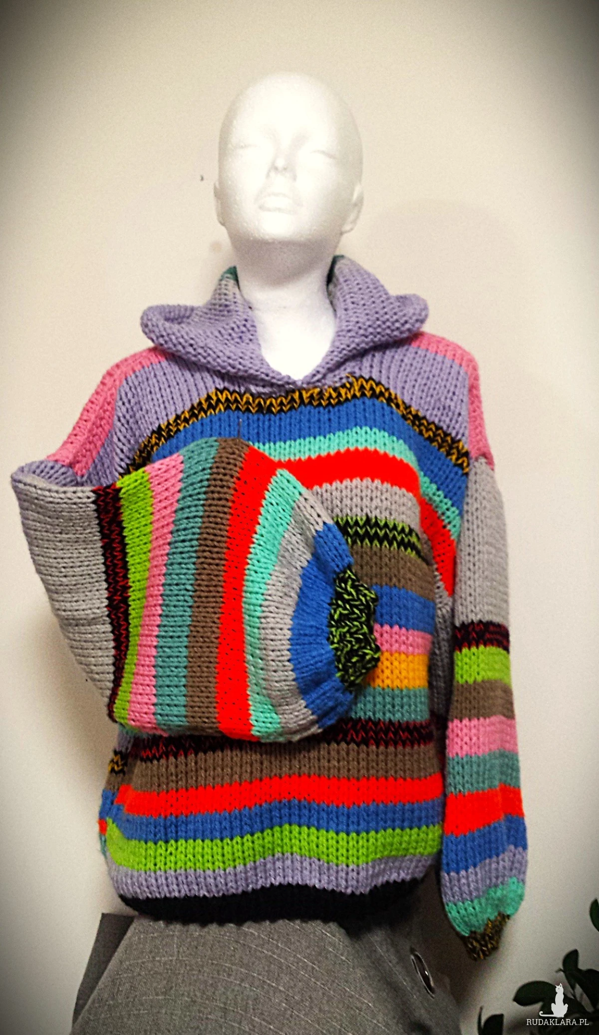 Oryginalny, praktyczny prezent dla Ciebie lub bliskiej osoby*** Ciepły kolorowy sweter z kapturem, typu oversize, wykony na drutach - z podwójnie robionej miękkiej włóczki akrylowej. Rozmiar uniwersalny (36-42). Możliwość wykonania w różnych wersjach kolorystycznych i rozmiarach, na zamówienie (czas wykonania 10 dni). Inne fasony na pozostałych moich aukcjach.
