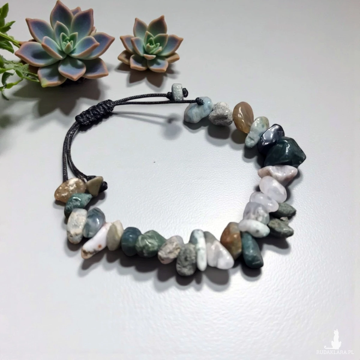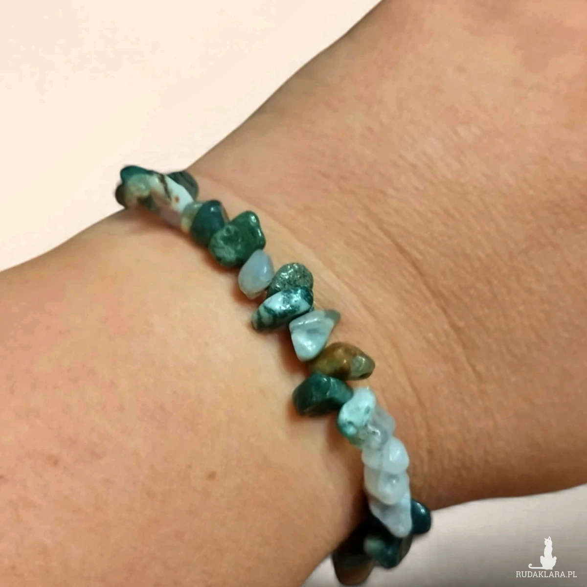 Bransoletka z naturalnych kamieni agatu indyjskiego to elegancka i wyjątkowa biżuteria. Nieregularny kształt kamieni oraz niezwykłe barwy ziemi - od białokremowej poprzez różne odcienie zieleni dodają jej uroku i tworzą z niej ciekawą i oryginalną ozdobę.