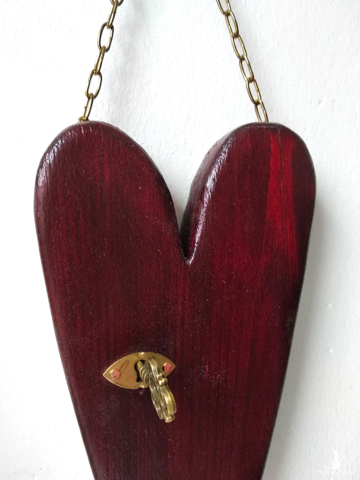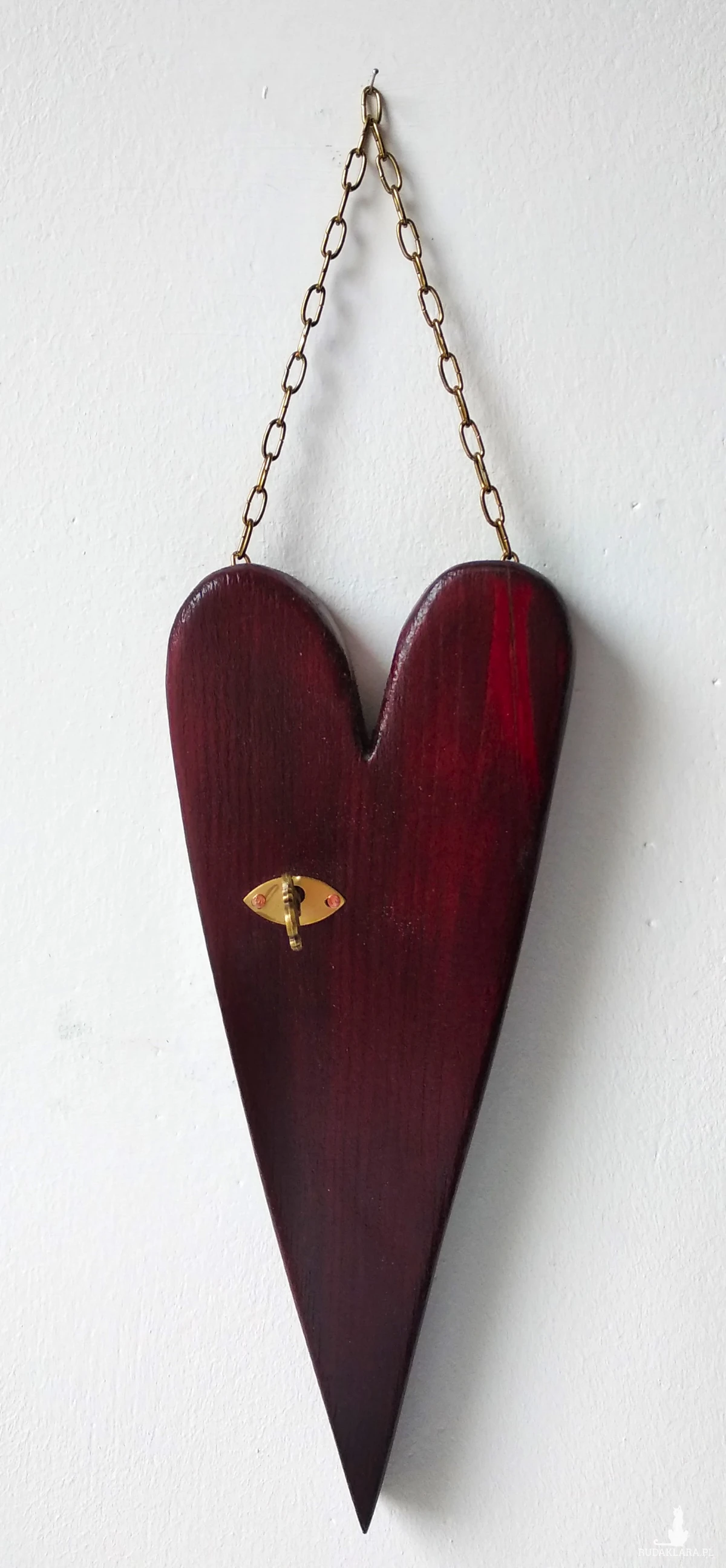 Wysokość serca 25 cm, szerokość 10 cm w najszerszym miejscu, wysokość razem z łańcuszkiem 35,5 cm.