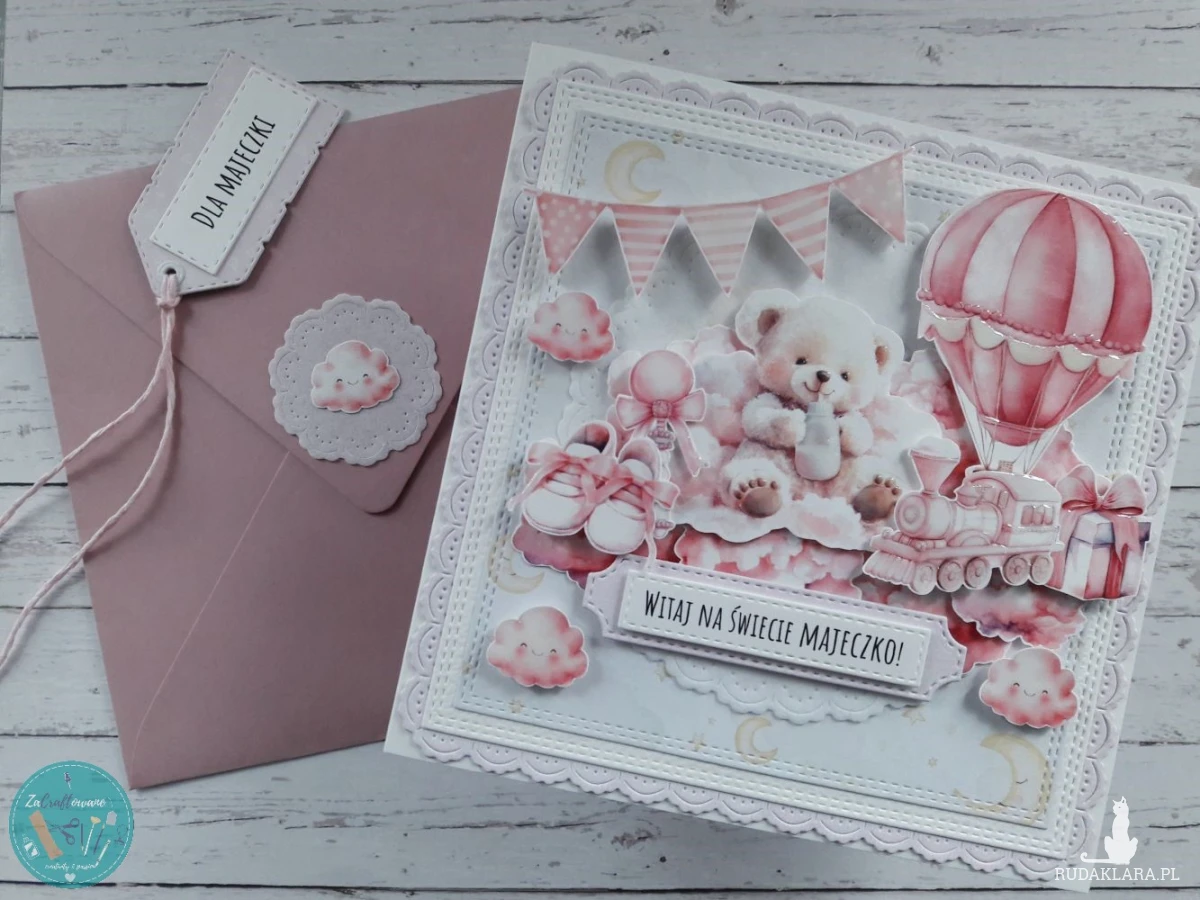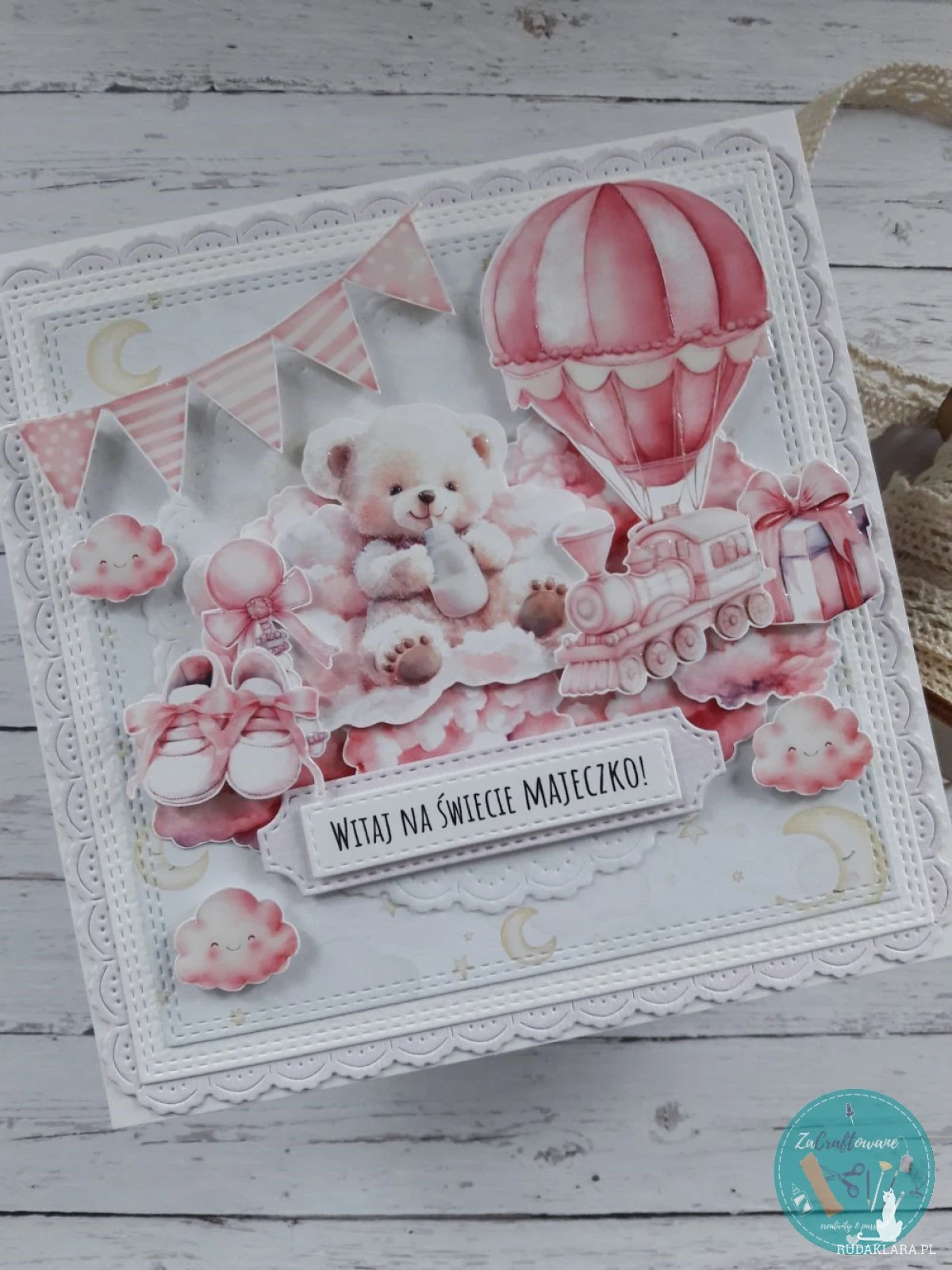 Kartka z okazji narodzin dziewczynki, której motywem przewodnim jest uroczy misiu leżący na chmurce w otoczeniu wesołych chmurek, zabawek i innych elementów.