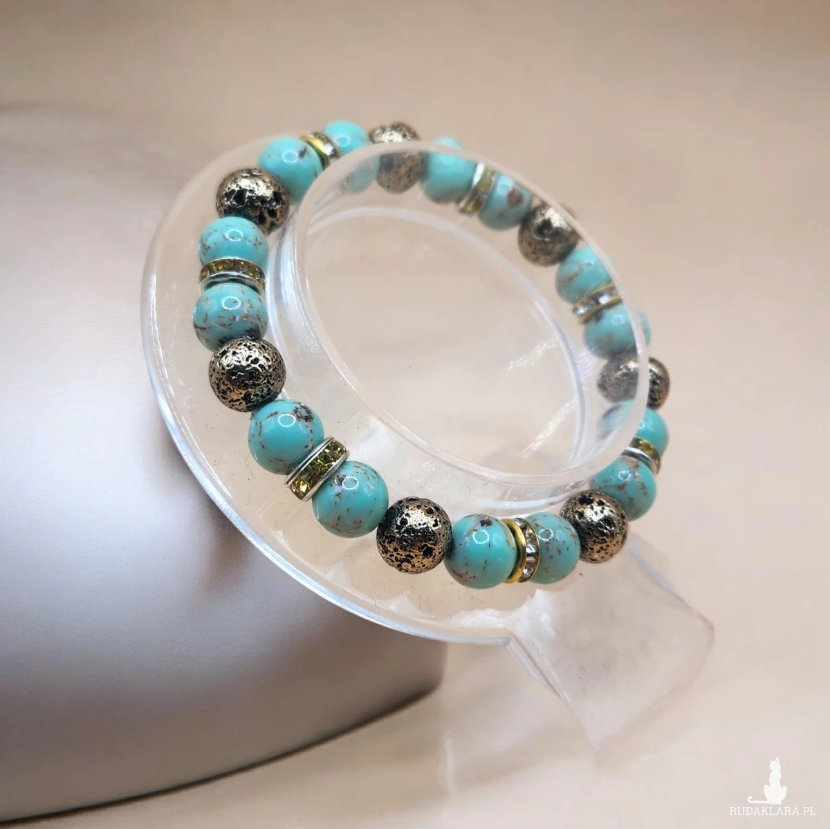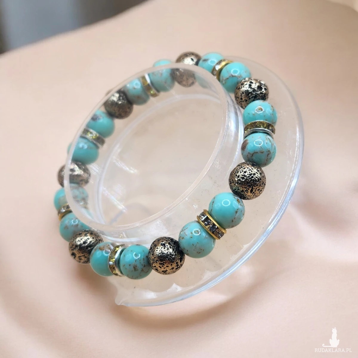 Stylowa, ręcznie wykonana bransoletka z koralików w pięknym turkusowym kolorze, przełamana ozdobnymi kulkami o fakturze postarzanego złota oraz eleganckimi przekładkami z połyskującymi kryształkami. Idealne połączenie boho i elegancji ✨