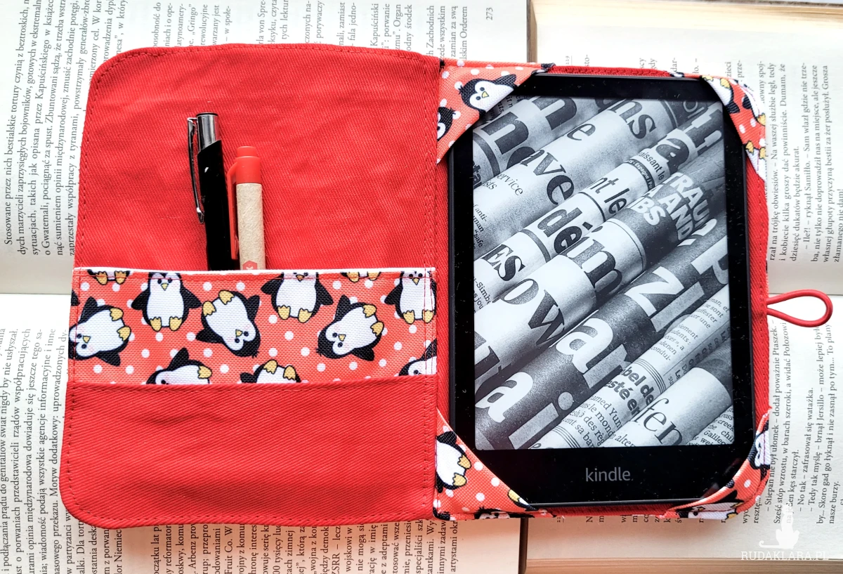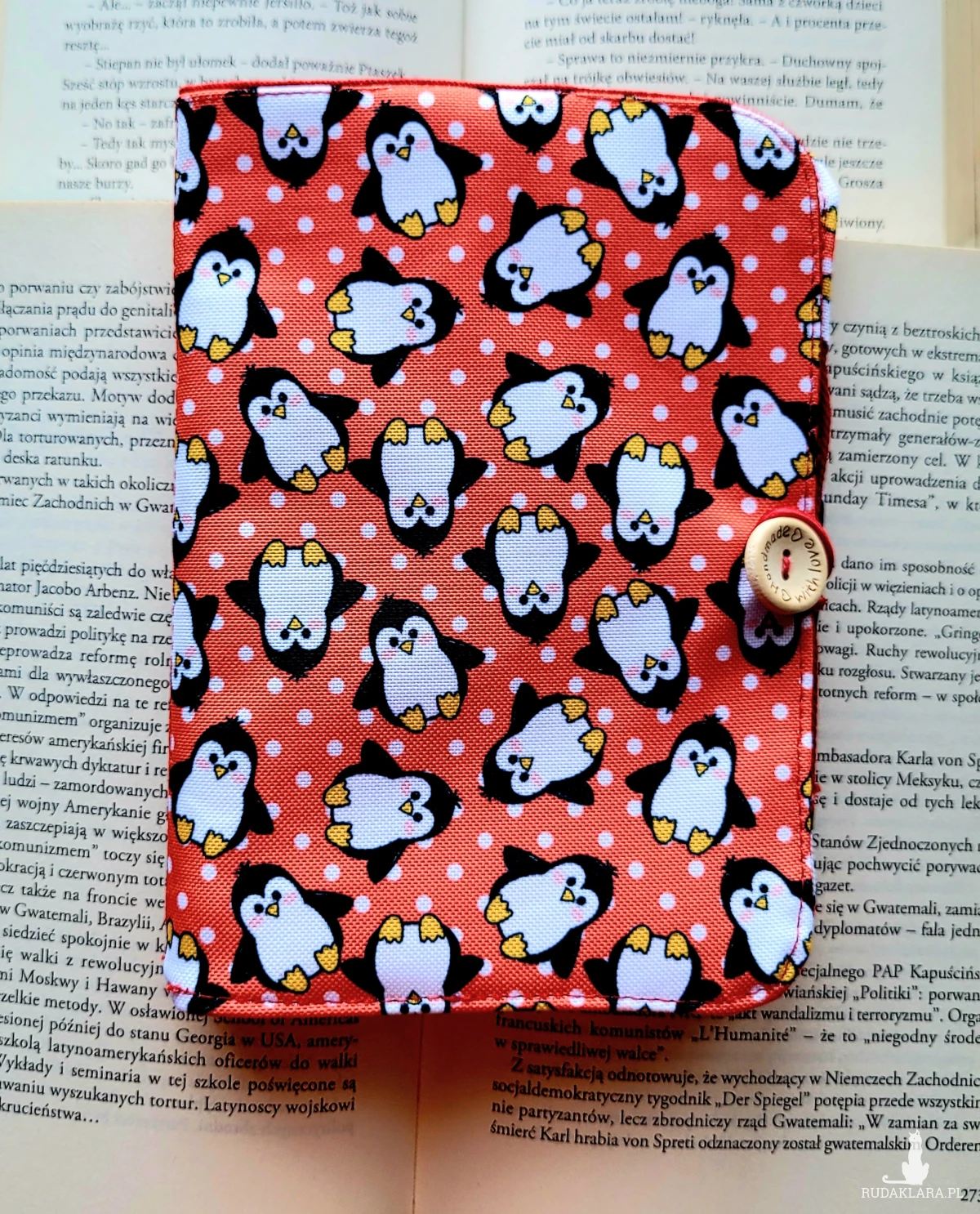Etui na czytnik w zimowym wzorze wesołych pingwinków.