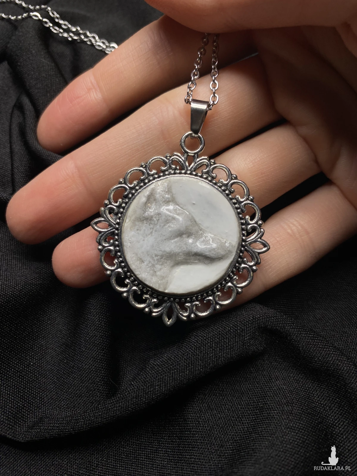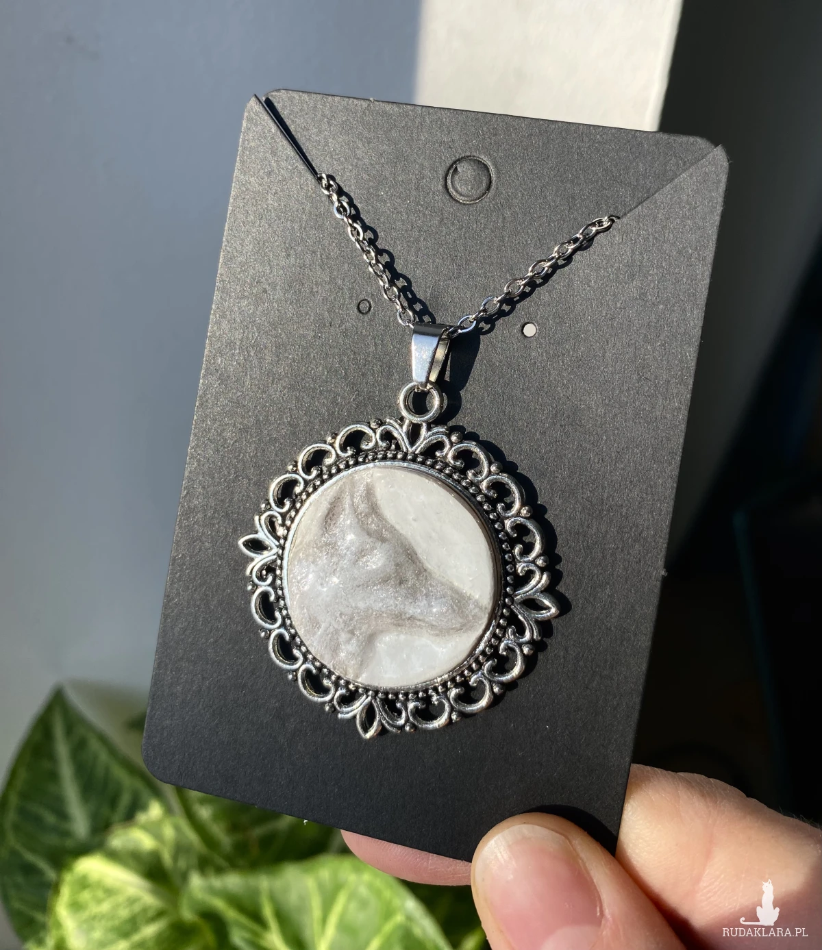 Wyjątkowy naszyjnik z okrągłym medalionem z rzeźbionym srebrnym lisem wykonanym z masy polimerowej , zabezpieczonym warstwą żywicy epoksydowej, która nadaje mu trwałość i subtelny połysk. Delikatny, marmurkowy wzór sprawia, że każdy egzemplarz jest niepowtarzalny.