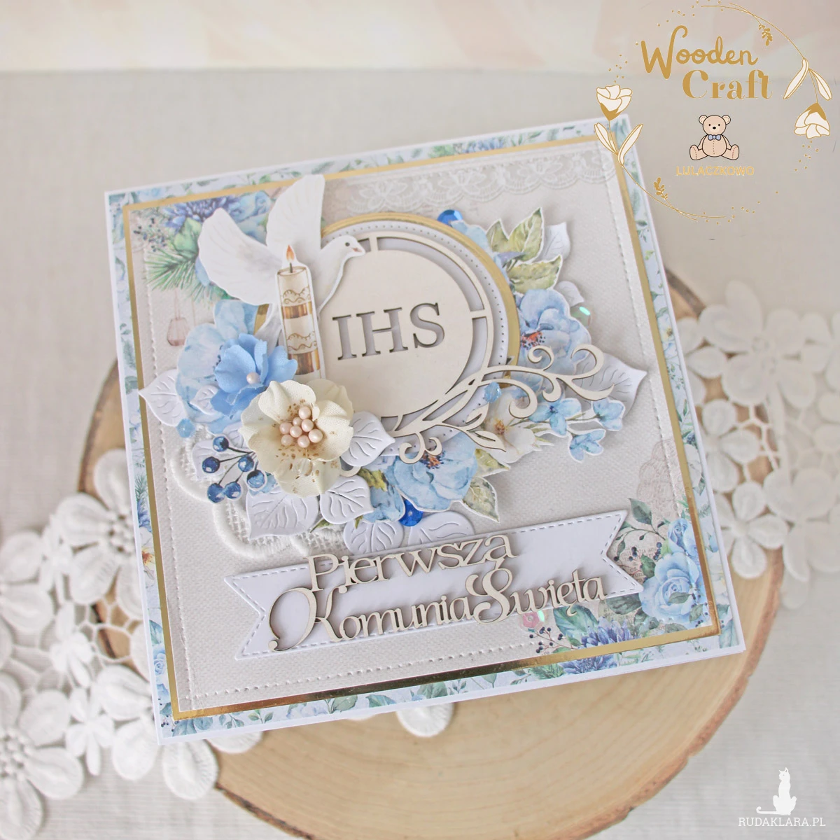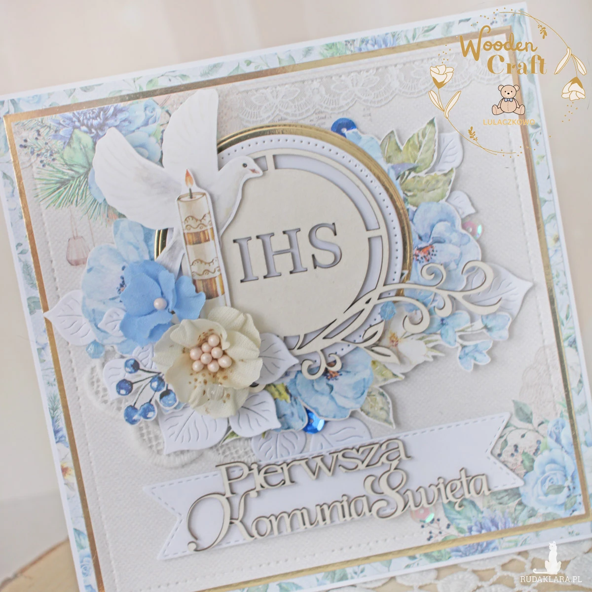 Piękna, elegancka kartka komunijna, pamiątka Pierwszej Komunii Świętej, wykonana ręcznie z najwyższą starannością, z cudownej kolekcji papierów "Sapphire Days", utrzymana w pastelowych odcieniach błękitu, kremu i bieli, z dodatkiem złotych, błyszczących akcentów. Na środku kartki umieszona została tekturka przedstawiająca hostię świętą otoczoną kompozycją kwiatową, z ręcznie wykonanymi, materiałowymi kwiatami, ozdobiona grafikami świecy komunijnej i gołębicy oraz tekturkowym napisem "Pierwsza Komunia Święta"- do napisu mogę również dodać imię dziecka.