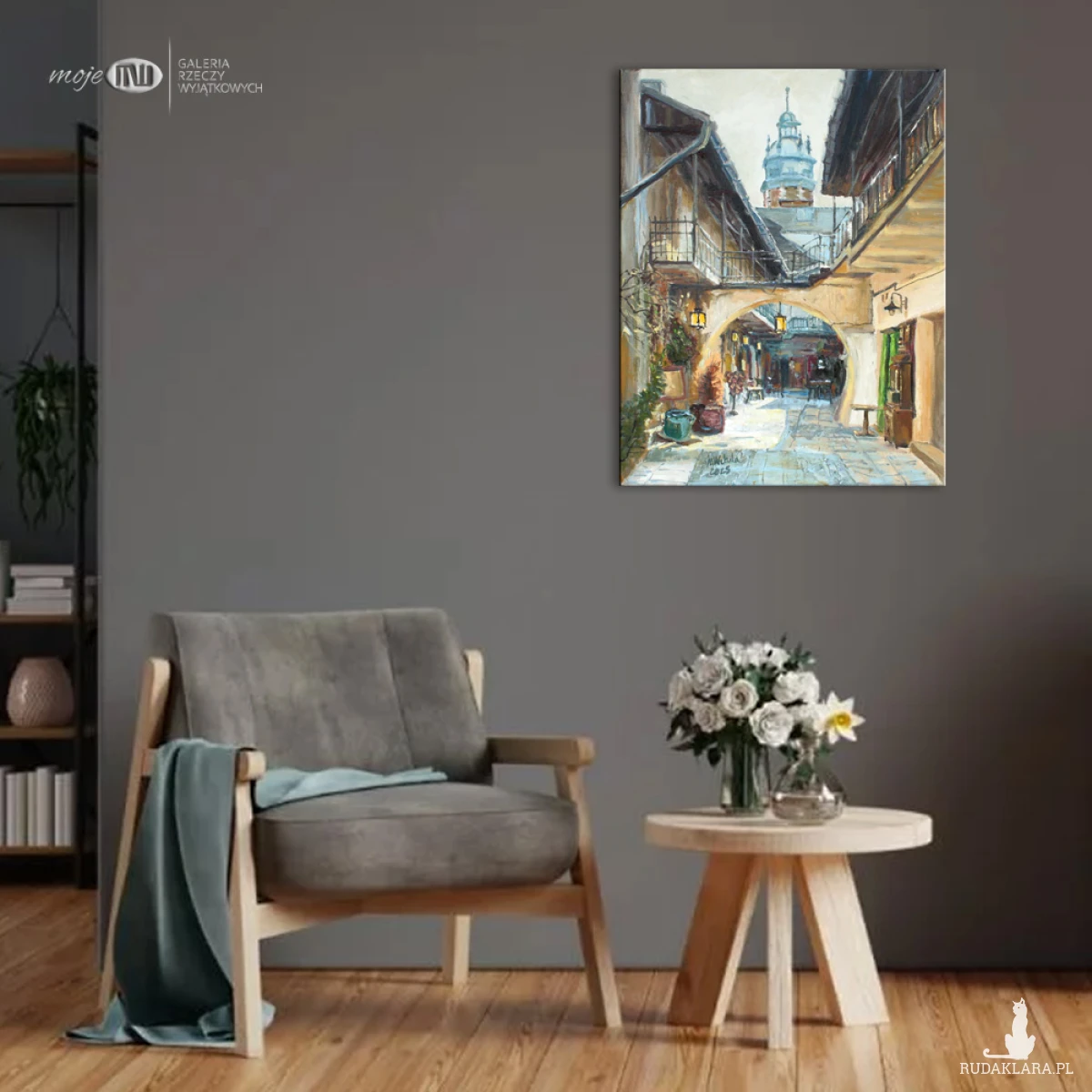 Obraz olejny malowany na płótnie, utrzymany w zawężonej palecie barw, z wyraźną dominantą ciepłych odcieni beżu i ciemnego brązu oraz dopełnieniem bieli i szarych błękitów.