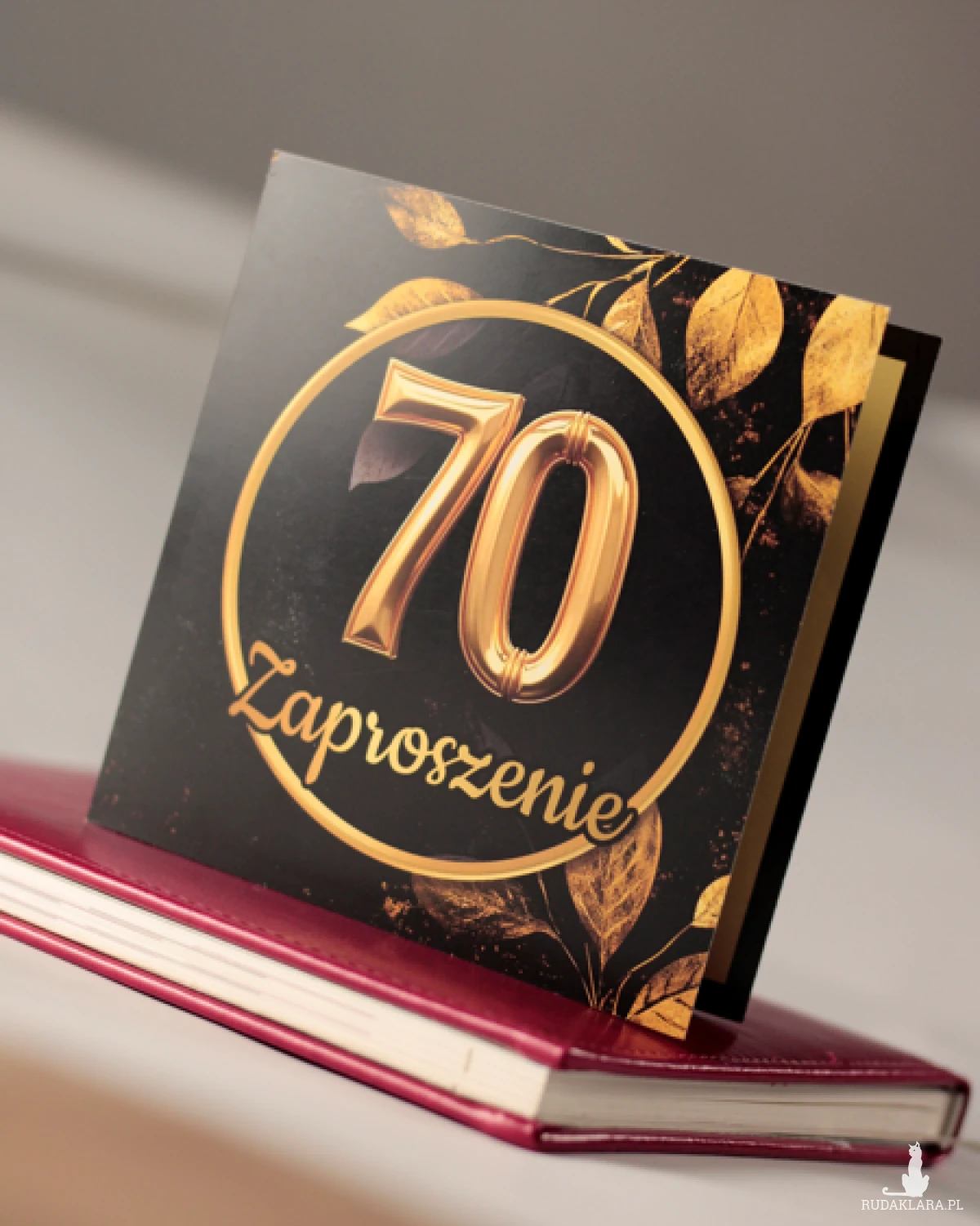 Zaproszenie na imprezę z okazji 70 urodzin. Zaproszenie składane do formatu 14x14. Wydruk cyfrowy na papierze kredowym o gramaturze 250g.