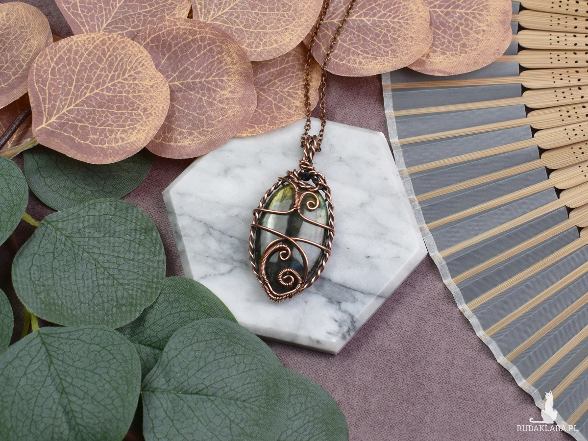Piękny wisiorek wykonany metodą wire wrapping z miedzią, ozdobiony mistycznym labradorytem. Kamień ten, znany również jako labradoryt, emanuje subtelnością odcieni niebieskiego i złota, nadając wisiorkowi wyjątkowy urok. Jego właściwości obejmują wzmacnianie intuicji, rozwijanie kreatywności oraz przynoszenie spokoju emocjonalnego. Noszenie tego wisiorka może być nie tylko modowym akcentem, ale także sposobem na zharmonizowanie energii i odczuwanie równowagi. To niezwykłe połączenie miedzi i labradorytu tworzy niepowtarzalny amulet, który przyciąga pozytywne wibracje i podkreśla unikalność noszącego.