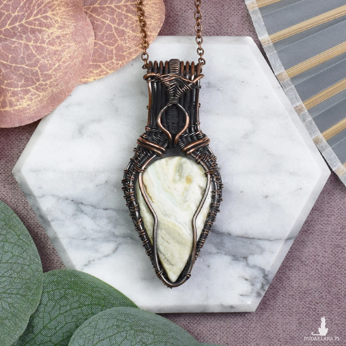 Miedziany wisiorek wykonany techniką wire wrapping z kamieniem larsonitem to niezwykłe połączenie naturalnej elegancji i ręcznej precyzji. Larsonit, znany również jako "kamień deszczu", zachwyca swoim unikalnym wzorem, który przypomina delikatne chmury na tle nieba. Ten kamień symbolizuje spokój, ochronę i równowagę, pomagając noszącemu w osiągnięciu wewnętrznego spokoju i klarowności myśli. Dodając temu wisiorkowi, wykonanemu z dbałością o szczegóły, osobisty akcent, możesz cieszyć się nie tylko jego estetyką, ale także pozytywnym wpływem larsonitu na Twoje życie.