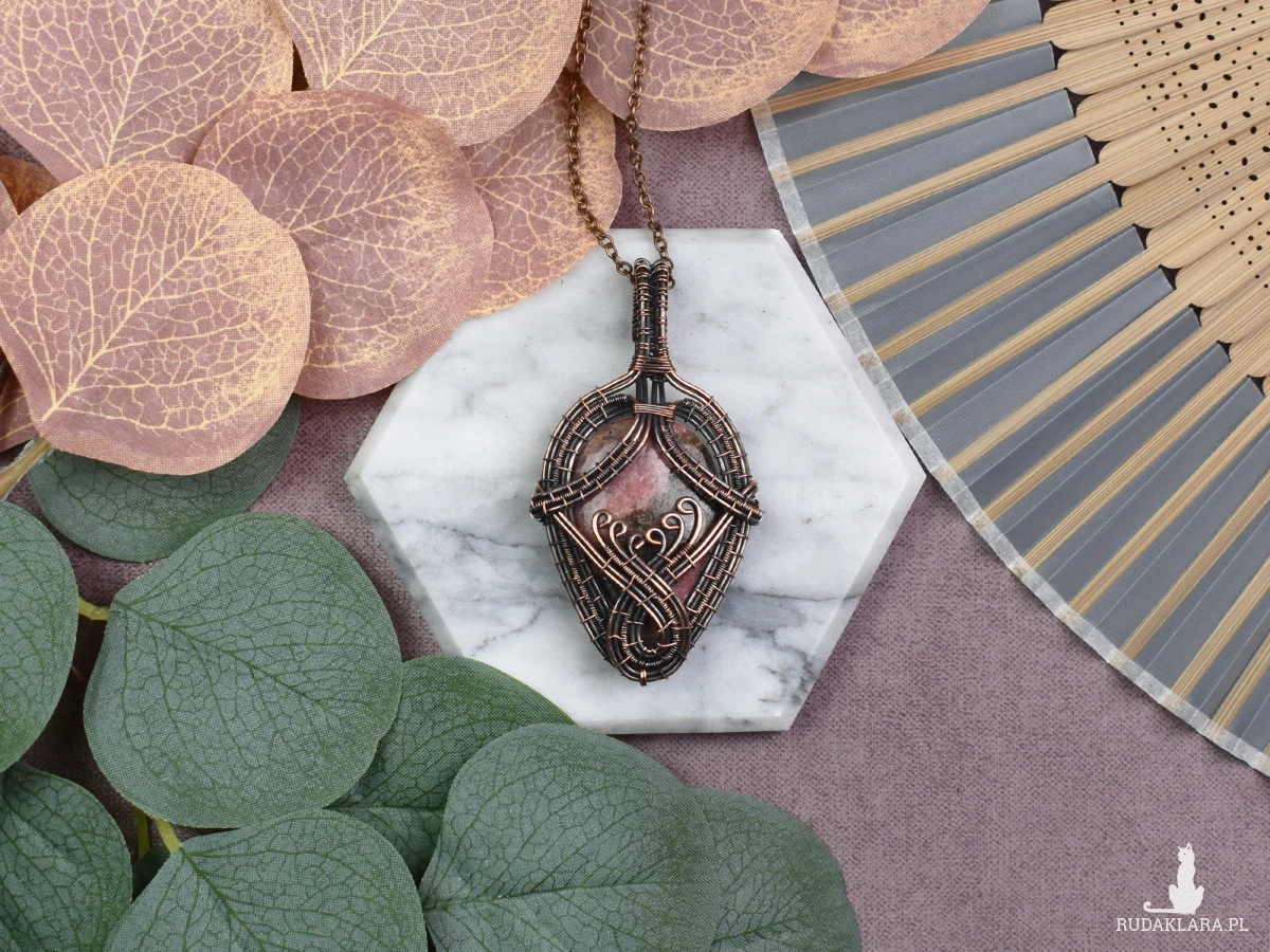 Miedziany wisiorek opleciony techniką wire wrapping, ozdobiony urokliwym kamieniem – rodonitem. Ten niezwykły wisiorek emanuje delikatnym pięknem i unikalnością. Kamień ten, znany również jako różowy różanecznik, dodaje subtelności i harmonii całej kompozycji. To doskonała biżuteria dla tych, którzy pragną nosić ze sobą nie tylko elegancję miedzi, ale także piękno naturalnych kamieni.