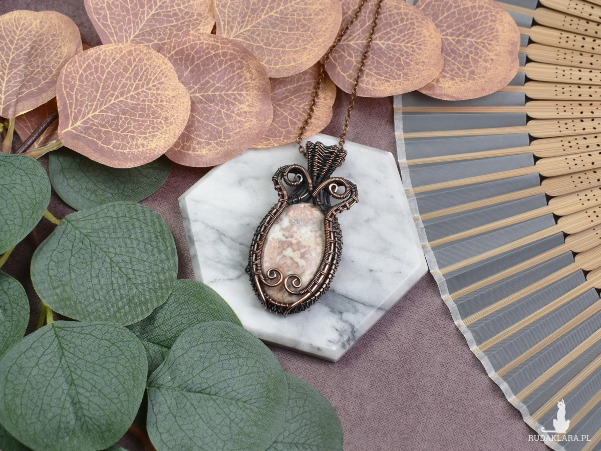 Miedziany wisiorek wykonany metodą wire wrapping z agatem to niezwykły dodatek do Twojej biżuterii. Agat, znany również jako kamień żywotności, przynosi harmonię i równowagę. Jego właściwości oczyszczające pomagają w radzeniu sobie z negatywnymi emocjami i wzmacniają wewnętrzną siłę. Ten unikatowy wisiorek nie tylko dodaje uroku Twojemu wyglądowi, ale także niesie ze sobą energetyczną moc natury, która wprowadza spokój i stabilność do Twojego życia. Idealny sposób na połączenie piękna biżuterii z korzyściami dla ciała i umysłu.