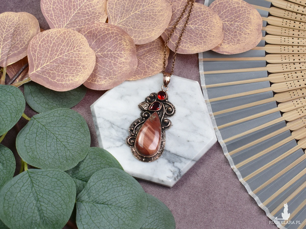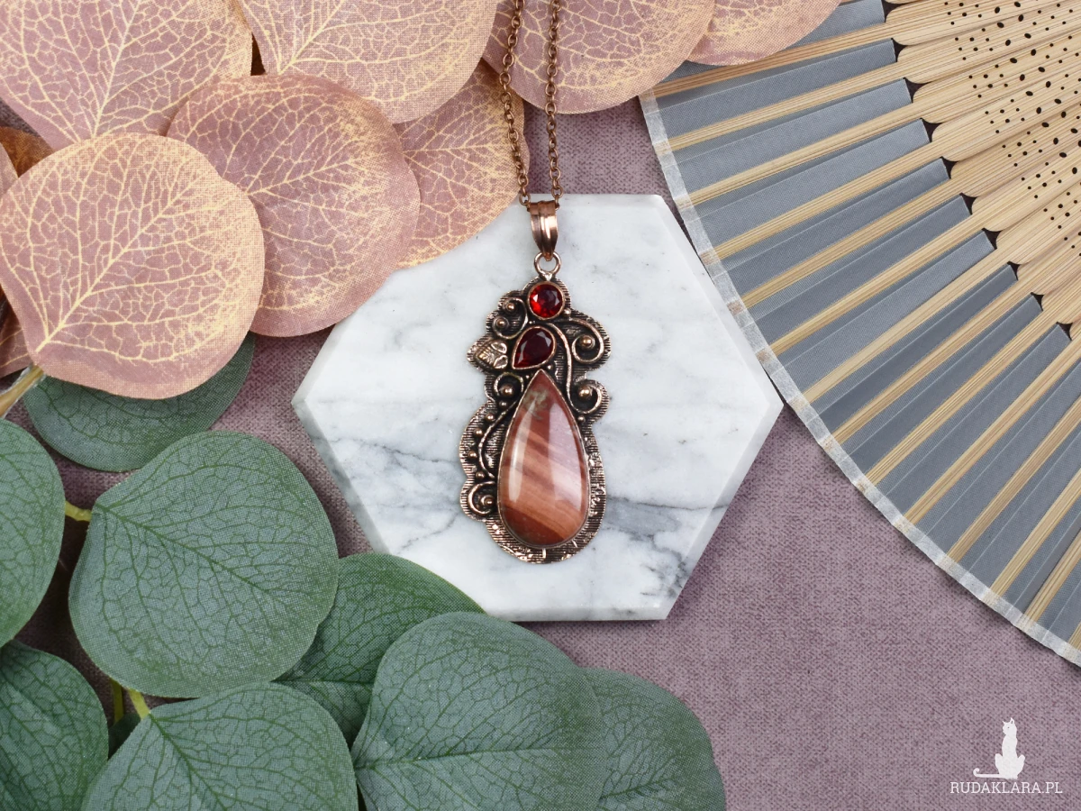 Elegancki miedziany wisiorek z czerwonym jaspisem i granatem to wyjątkowy dodatek do każdej stylizacji. Jaspis przynosi energię i witalność, dodając pewności siebie, podczas gdy granat symbolizuje siłę, odwagę i pasję. Te kamienie nie tylko ozdabiają, ale również przynoszą ze sobą pozytywne właściwości, tworząc unikalny i znaczący element biżuterii.