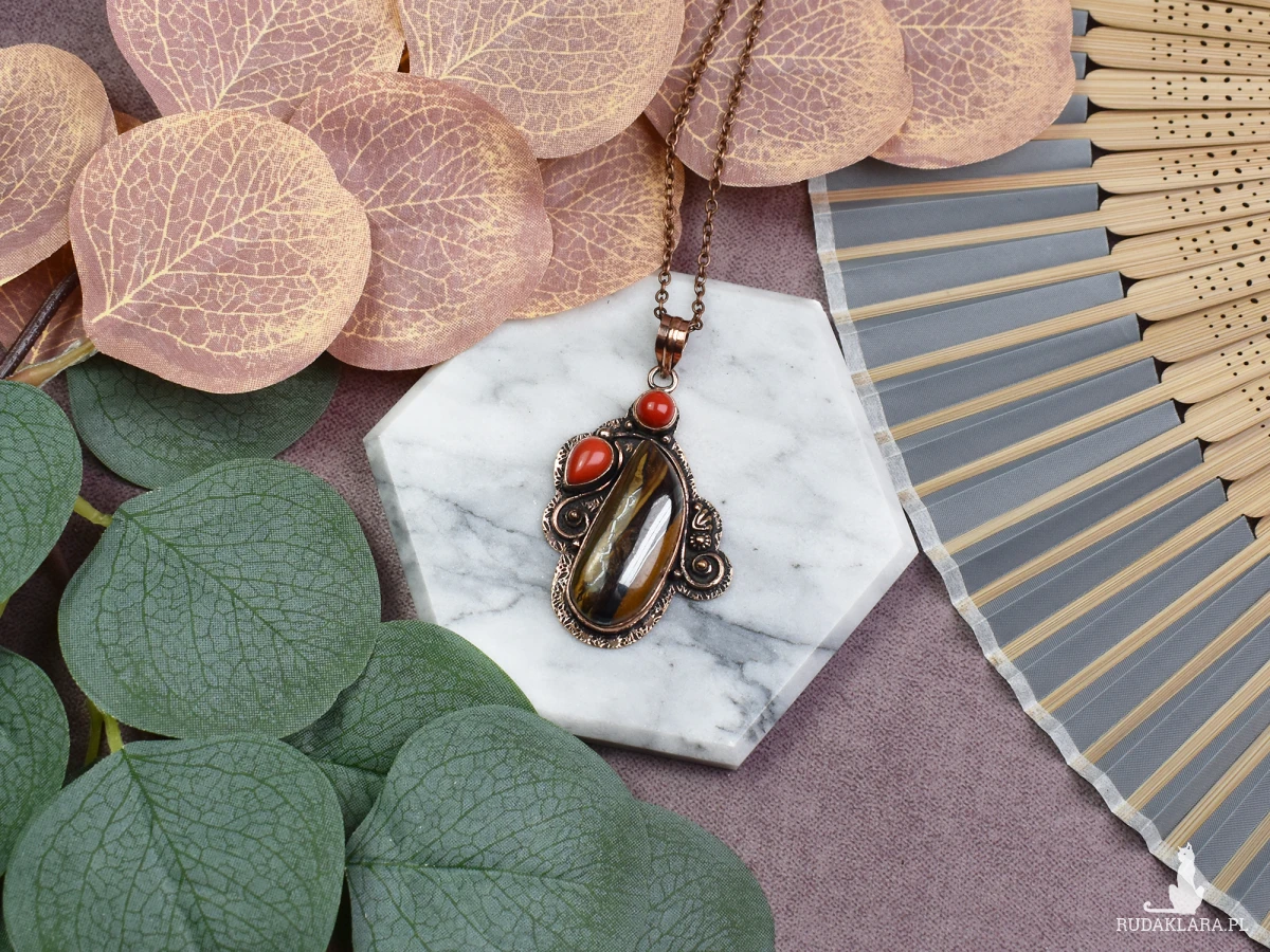 Piękny miedziany wisiorek z tygrysim okiem i koralem to nie tylko wyjątkowy dodatek do stylizacji, ale również talizman o wyjątkowych właściwościach. Tygrysie oko jest znane z przyciągania pewności siebie i odstraszania negatywnej energii, dodając pewnego pazura każdemu krokom. Koral natomiast symbolizuje ochronę i siłę życiową. Nosząc ten wisiorek, nie tylko podkreślisz swoją elegancję, ale również otoczysz się pozytywnymi wibracjami, zyskując zarówno stylowy dodatek, jak i osobisty amulet.